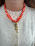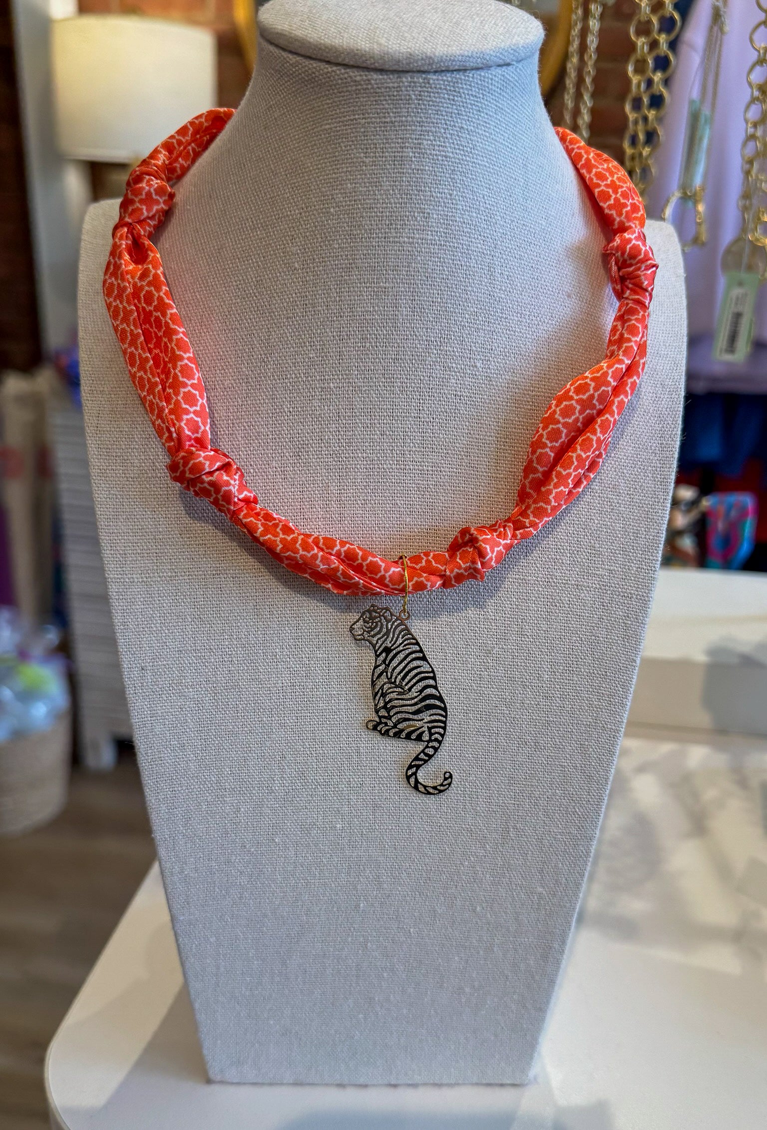 Make a bold statement this game day with the Alecia Scarf Charm Necklace, where spirited style meets elevated flair! Featuring a silky orange and white geometric patterned scarf woven into a knotted design, this piece brings texture and team pride to your outfit. The look is finished with a luxe gold sitting tiger charm for a touch of glam that shines just as bright as your Tiger spirit. Whether worn as a necklace or wrapped around a bag, this versatile accessory is your go-to for playful, fashion-forward game day vibes.
