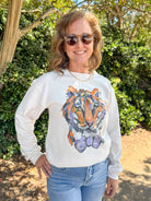 Show your Tiger spirit in style with this hand-painted sweatshirt! Featuring a bold tiger face in vibrant orange and purple brushstrokes, this piece blends cozy comfort with true game day pride. The lightweight crewneck design makes it perfect for layering on cooler days, while the unique artwork ensures you’ll stand out in the crowd. Pair it with jeans for a casual look or dress it up with a skirt and boots for tailgates and beyond.