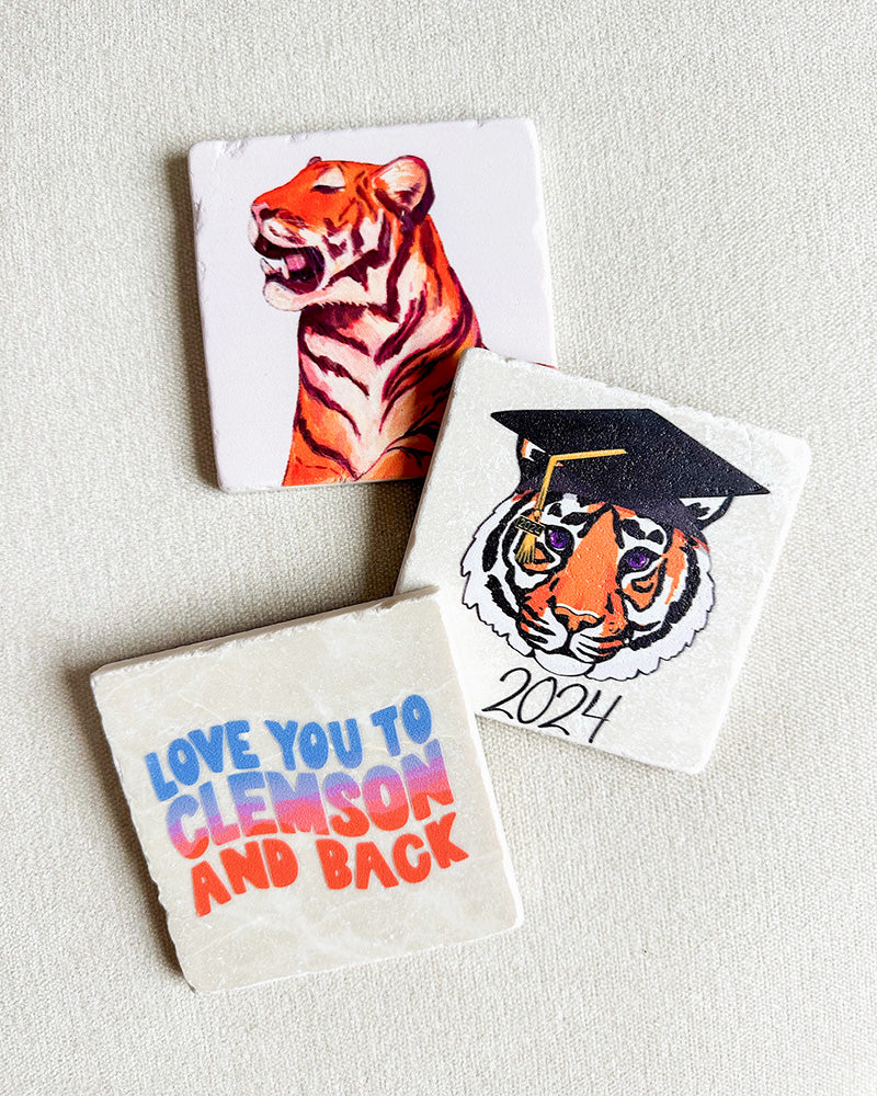 The perfect gift for your Tiger Grad! Add this coaster to your coffee table to reminiscence your time here at Clemson. A sweet gift to treasure for years to come! A beautiful design from Cherry Day Art!