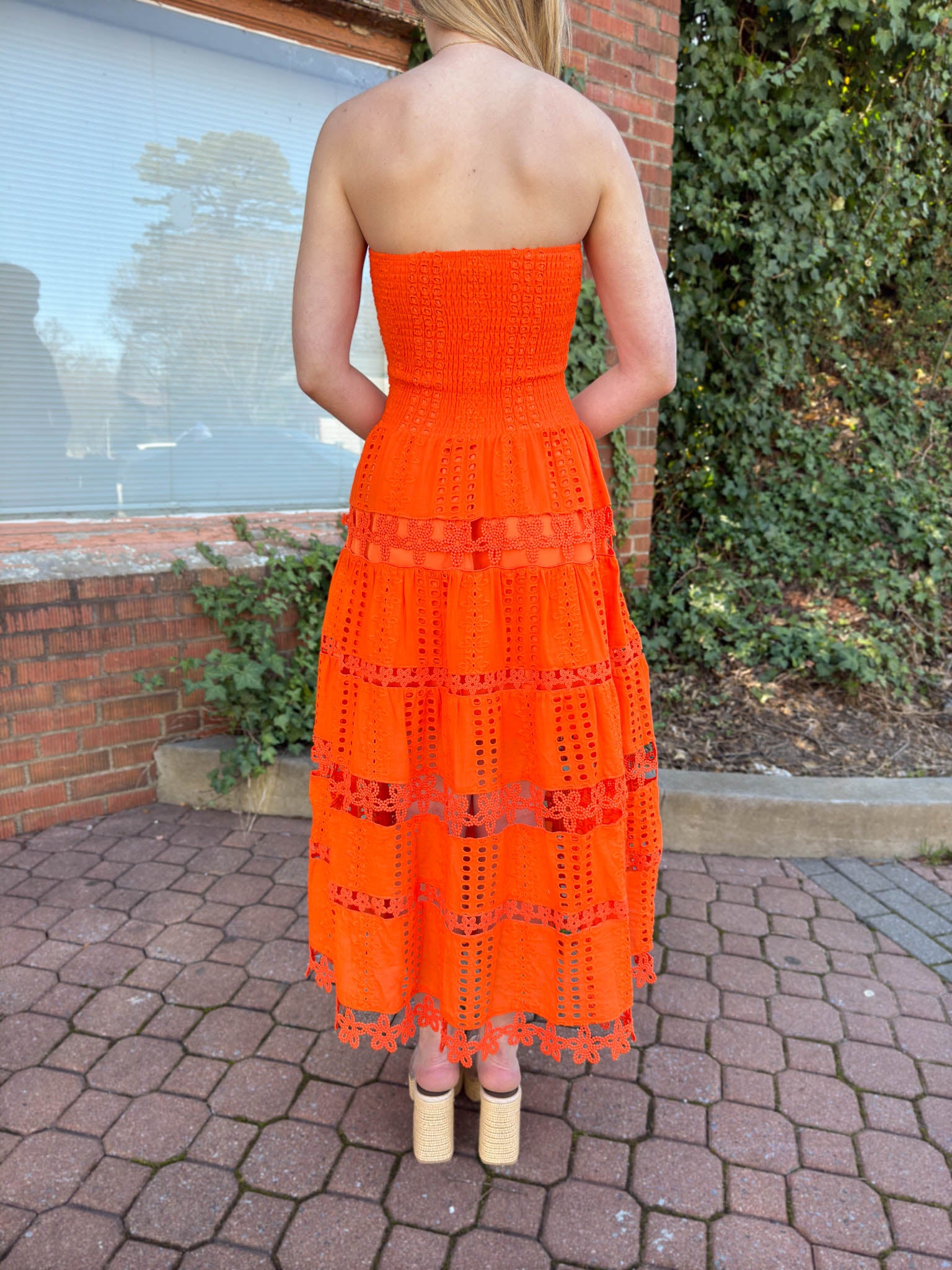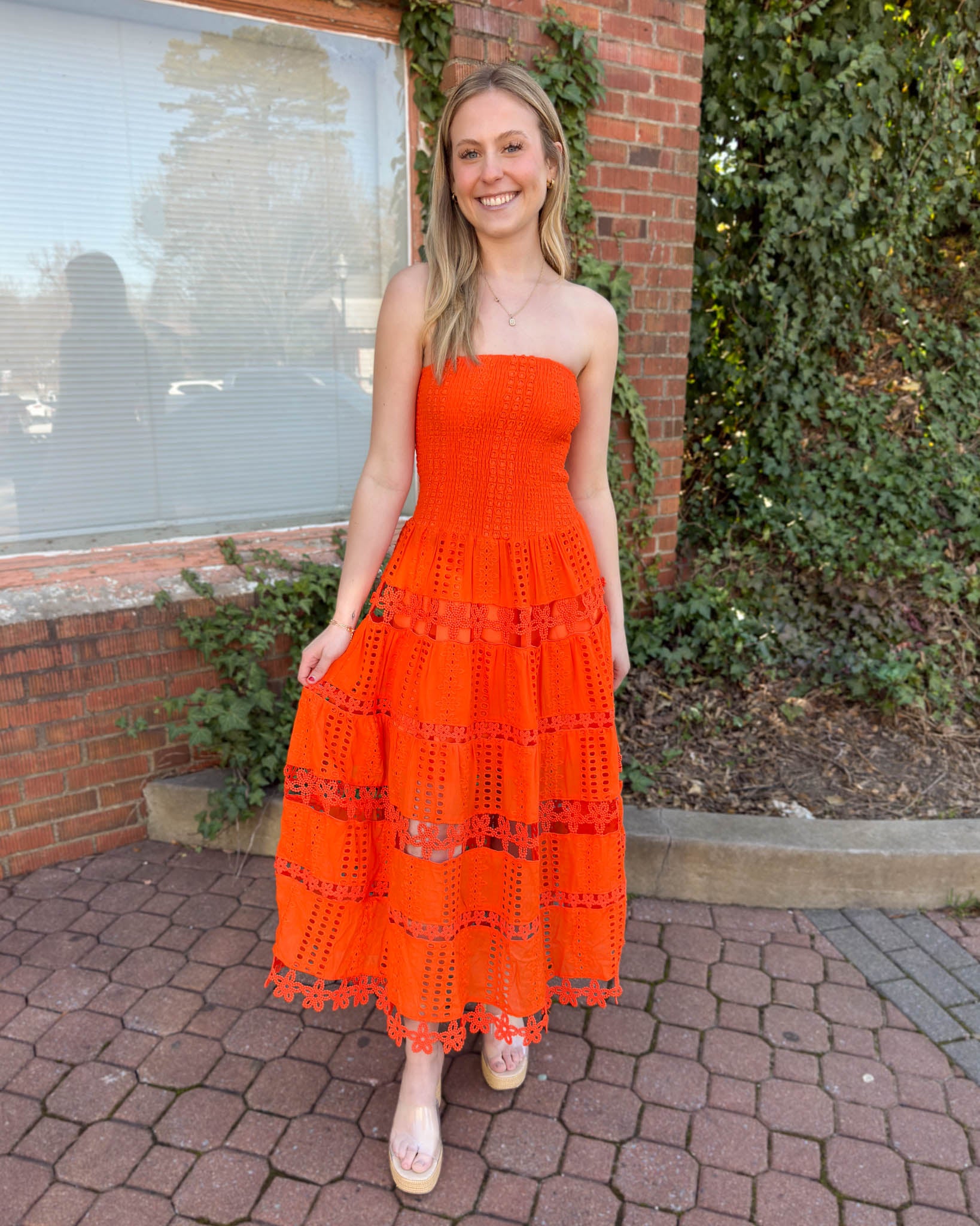 This dress is a vibrant, strapless midi dress in a striking shade of orange. It features a fitted, smocked bodice that provides a flattering and comfortable fit. The skirt flares out in a tiered design, adorned with intricate eyelet lace detailing that adds texture and elegance. The cutouts between the tiers create a subtle, airy effect, perfect for warm weather. The hem is finished with delicate scalloped lace, enhancing its feminine charm. This dress is ideal for summer events, vacation outings, or any occasion where you want to make a bold and stylish statement.