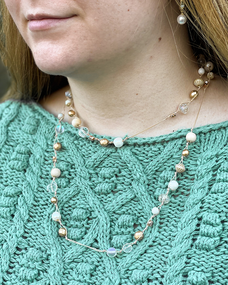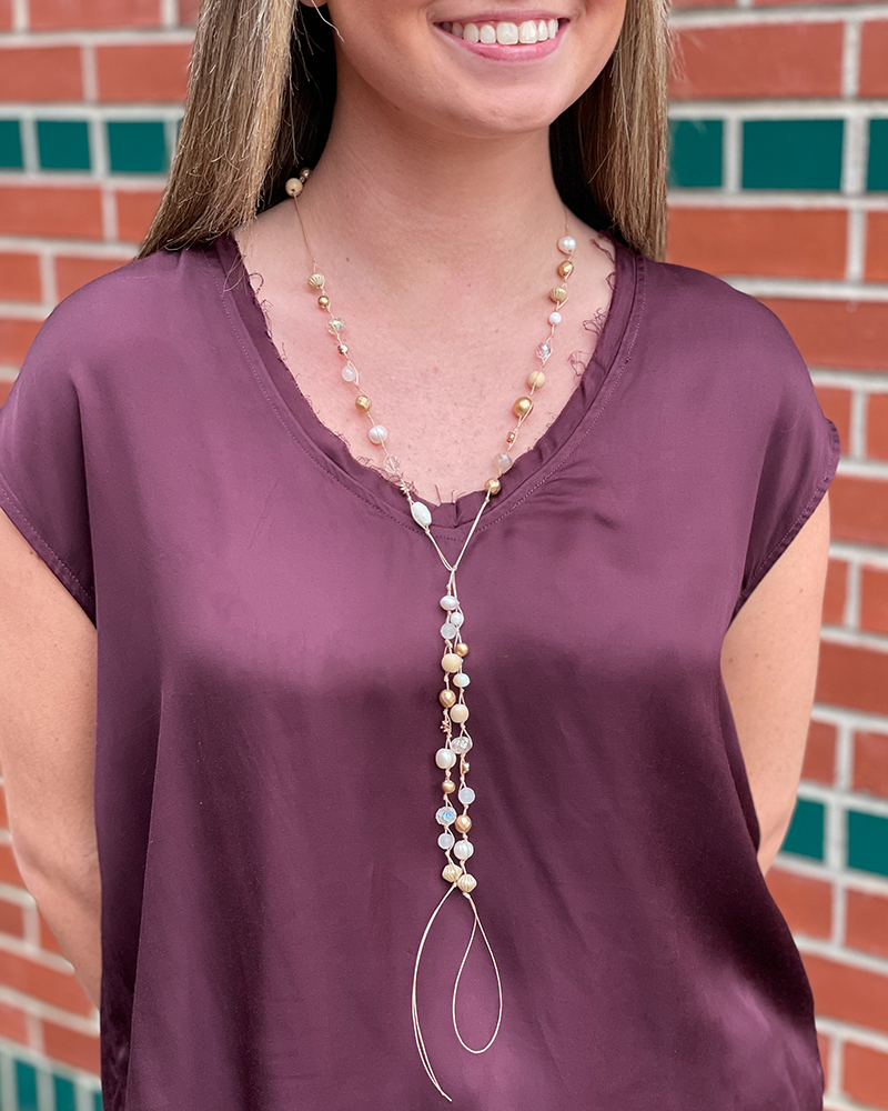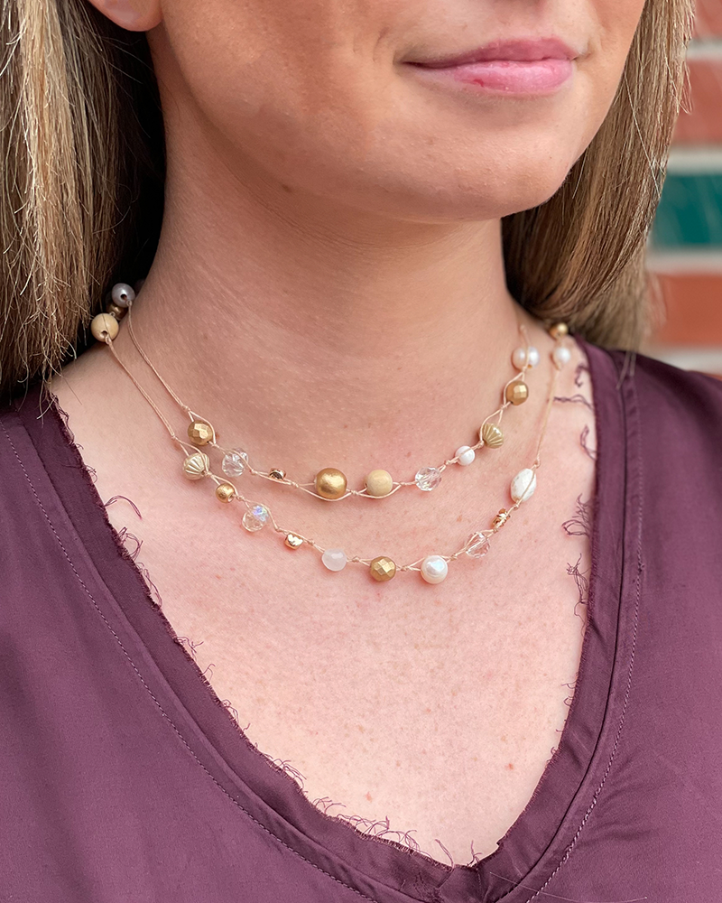 Our favorite unique piece of jewelry in a classic pearls and shades of tan. 50 hand-knotted beads that represent five decades of the rosary.