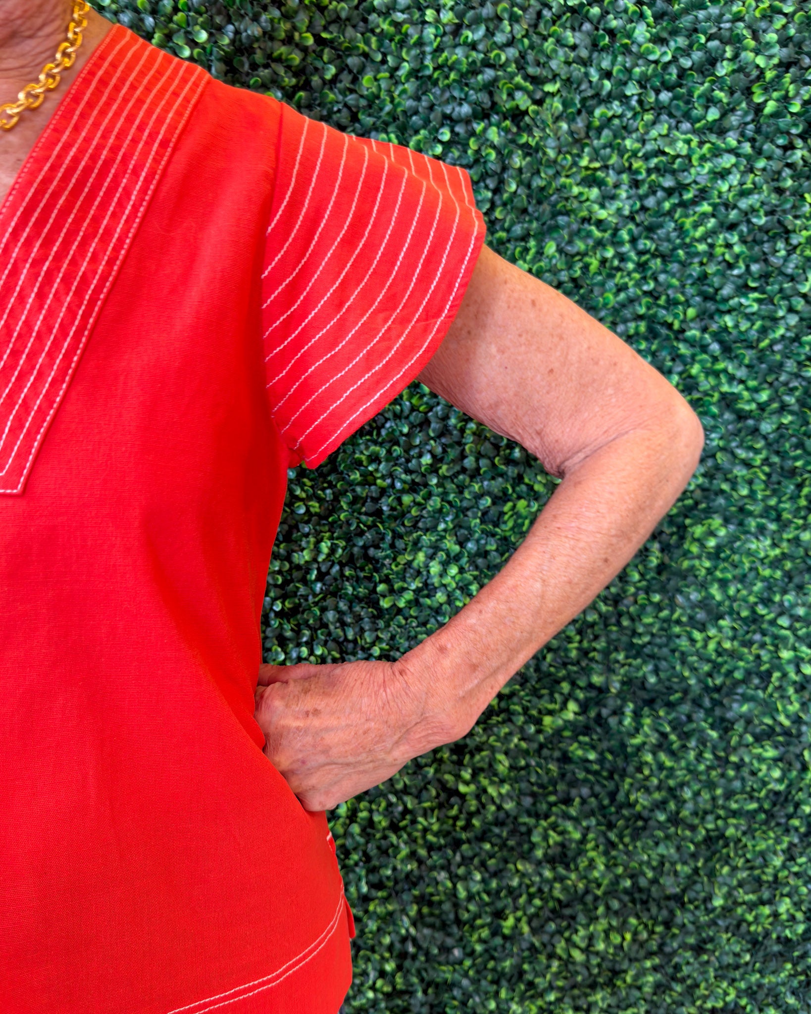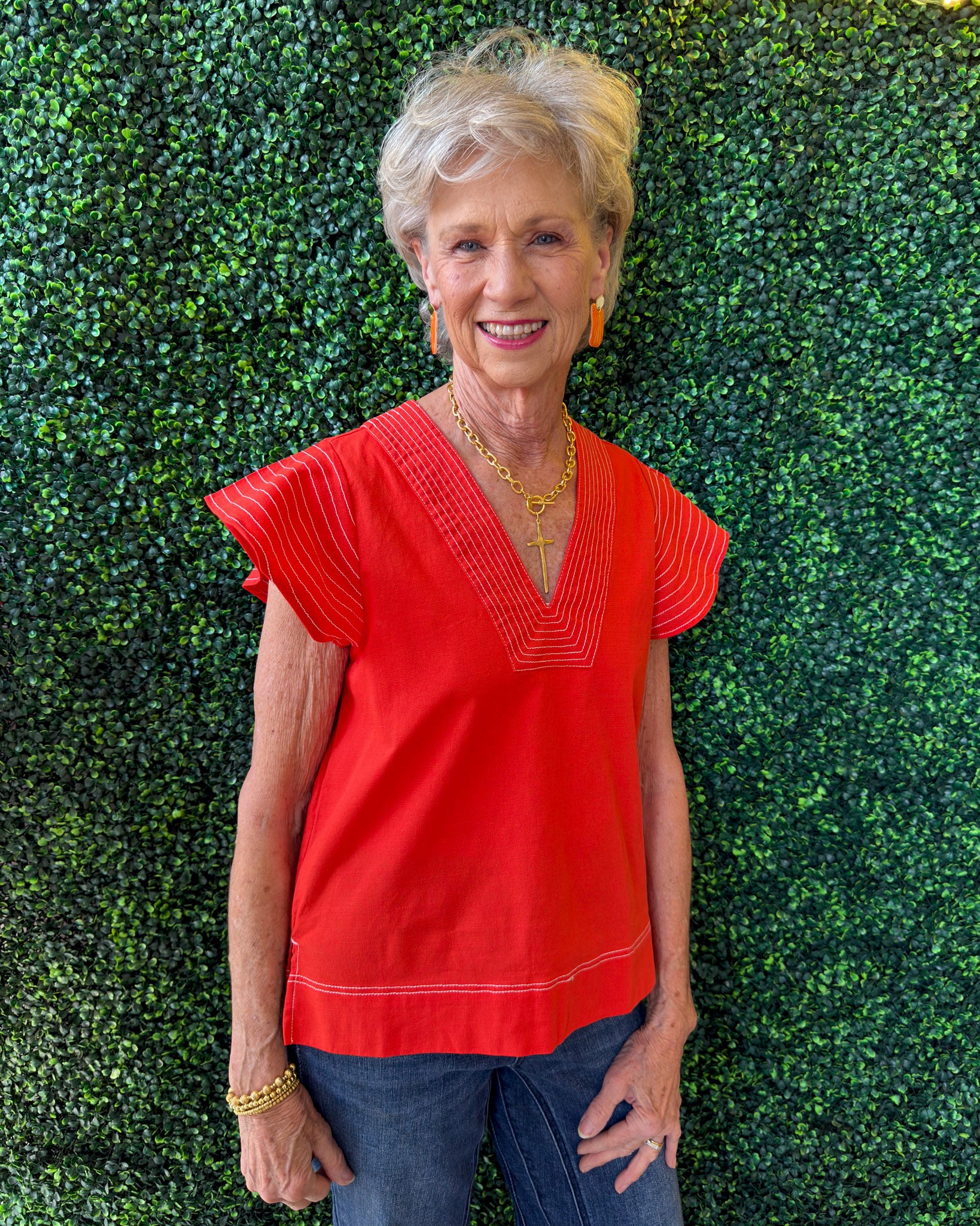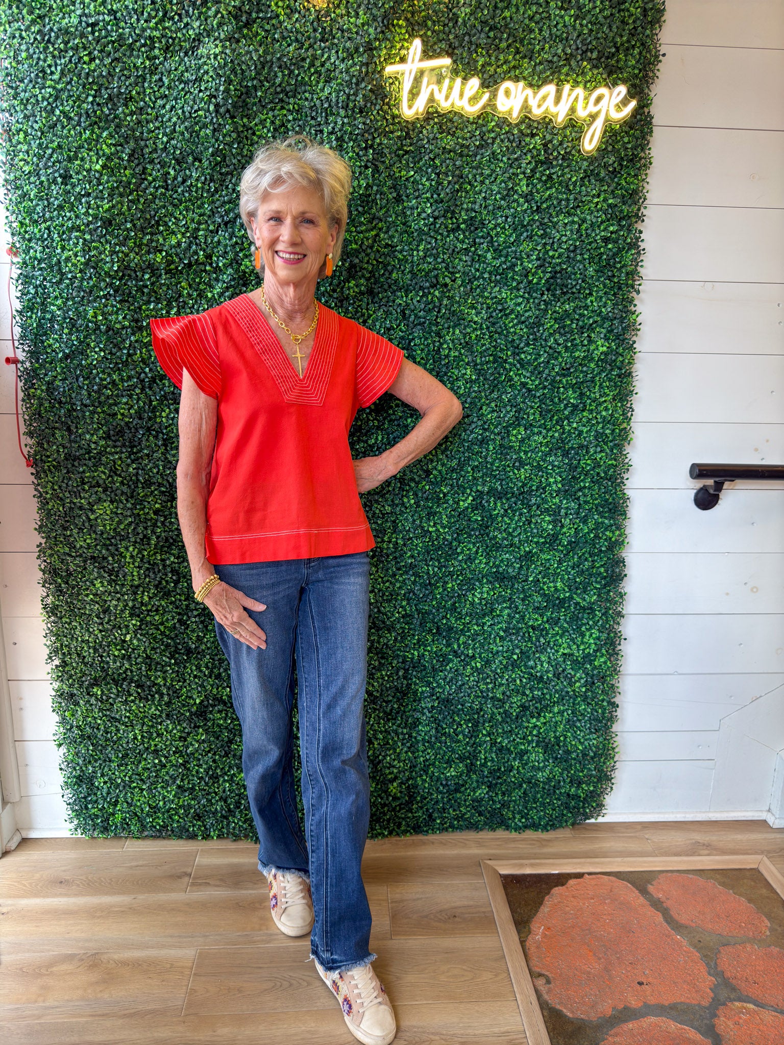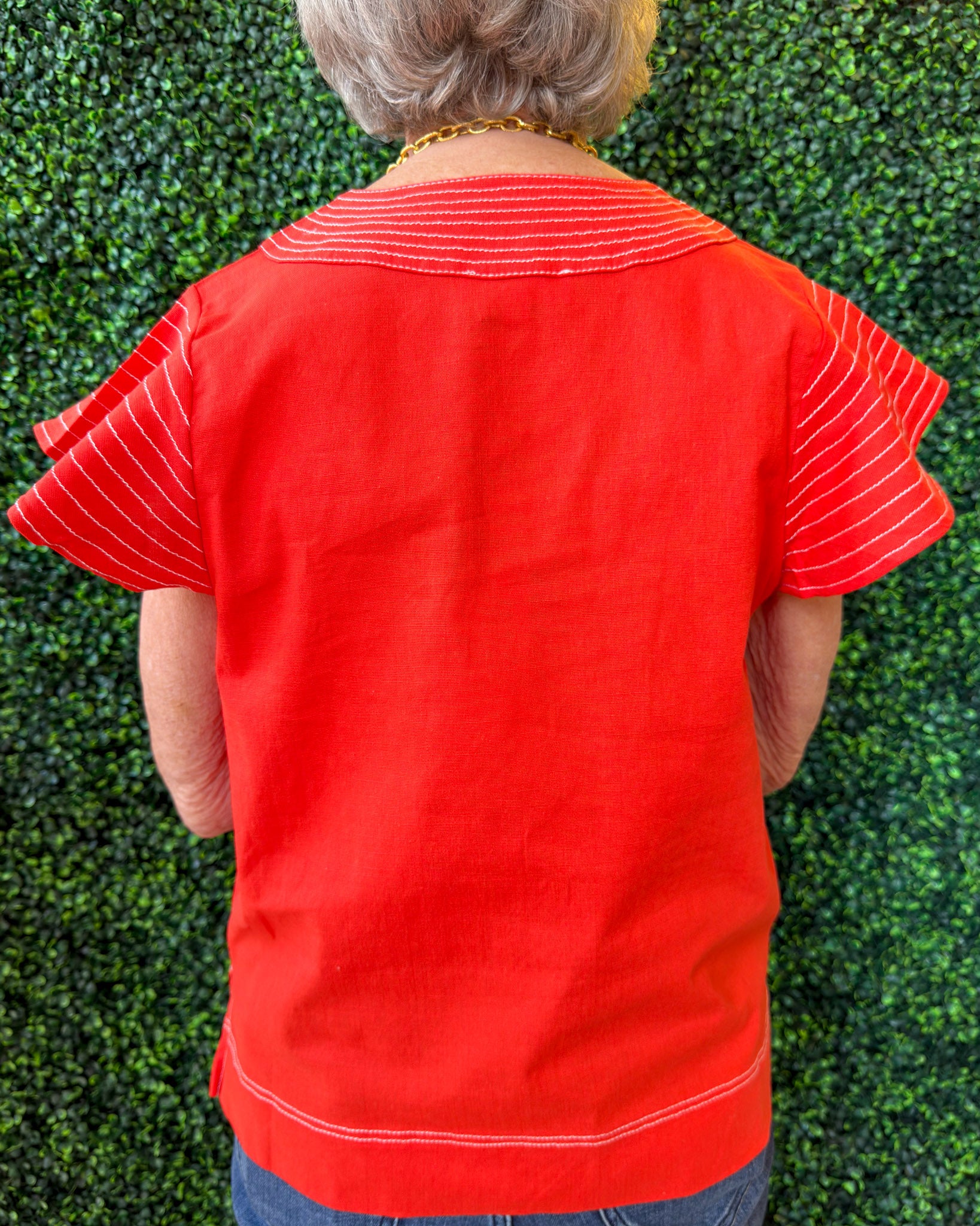This bright shirt features delicate flutter sleeves that softly billow at the shoulders, adding a light and airy feel. Its relaxed fit and breathable fabric make it a perfect, vibrant choice for sunny spring days.