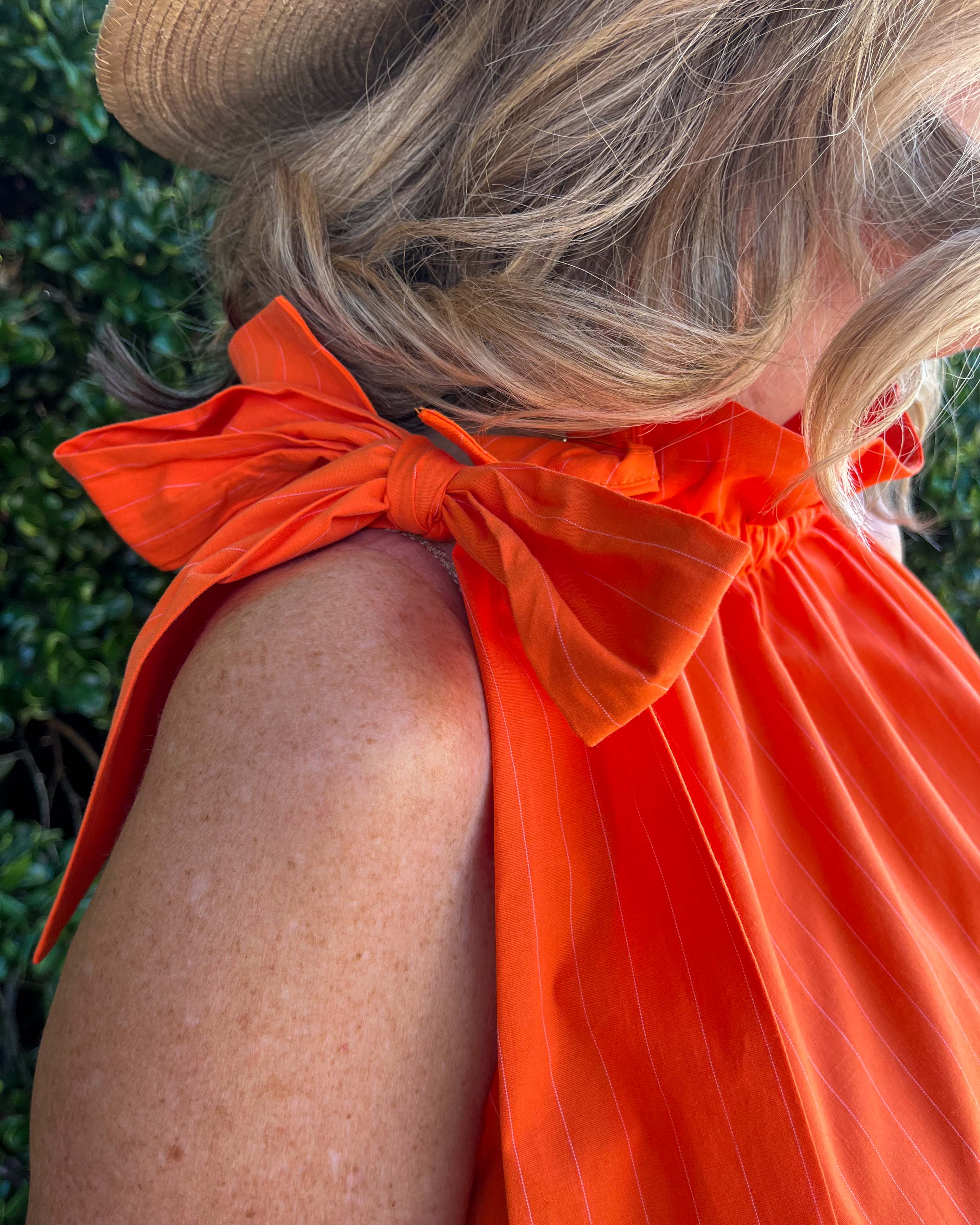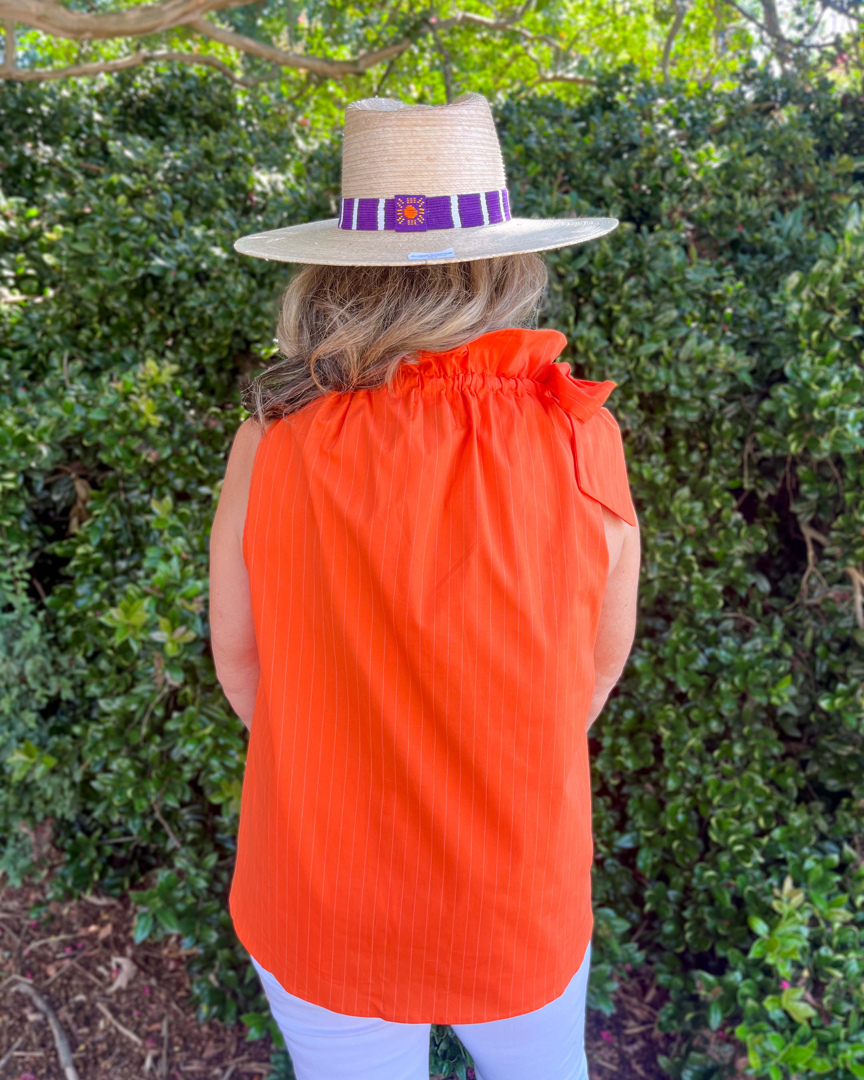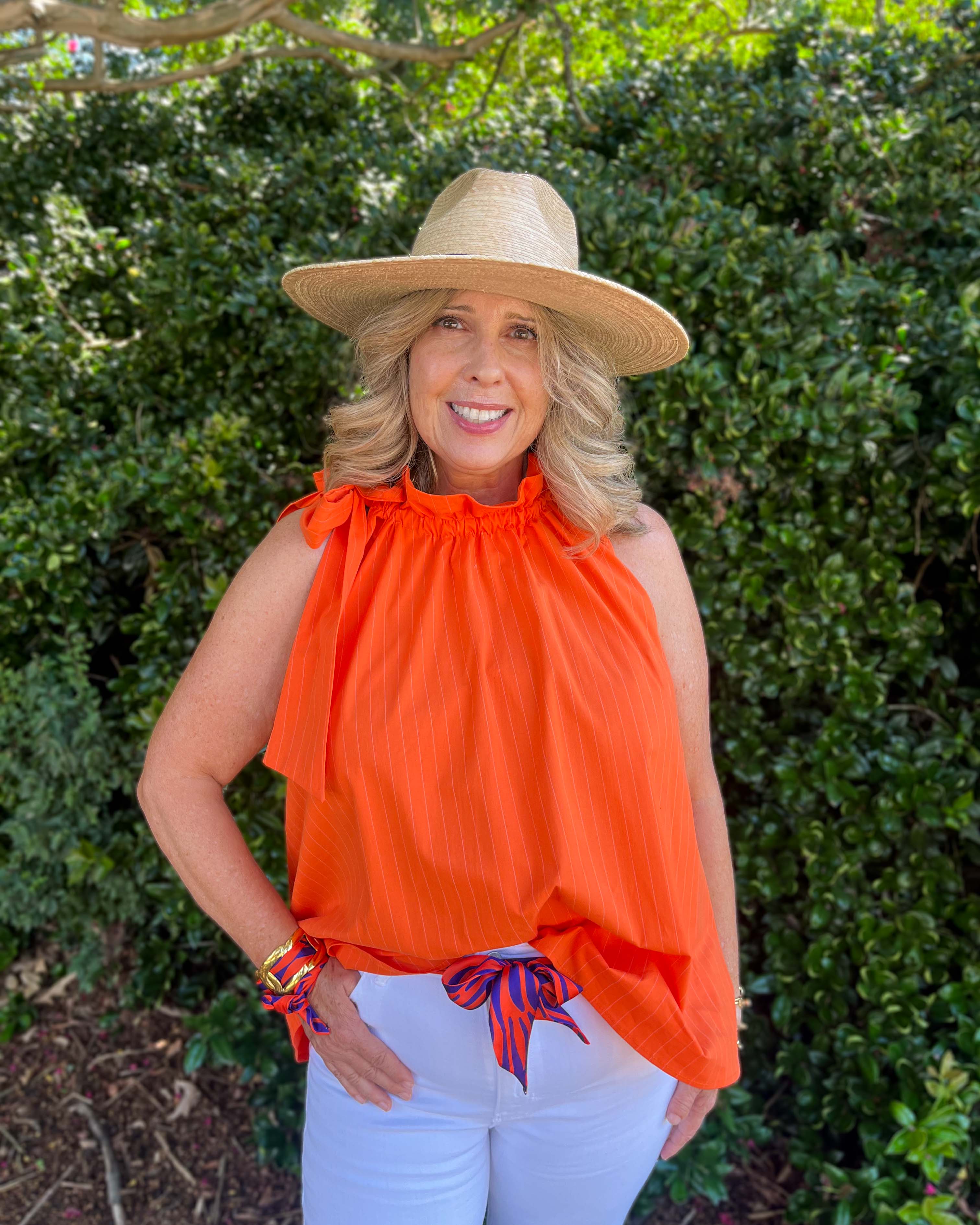 This vibrant orange sleeveless top is a sunshine-ready staple with feminine flair. Featuring subtle pinstripes and oversized bow tie details on the shoulders, it’s playful, polished, and perfect for warm-weather outings or game day spirit. The gathered neckline adds softness and shape, while the lightweight fabric keeps it breezy and comfortable. Pair it with crisp white denim and a wide-brim hat for a look that’s effortlessly chic and full of personality.