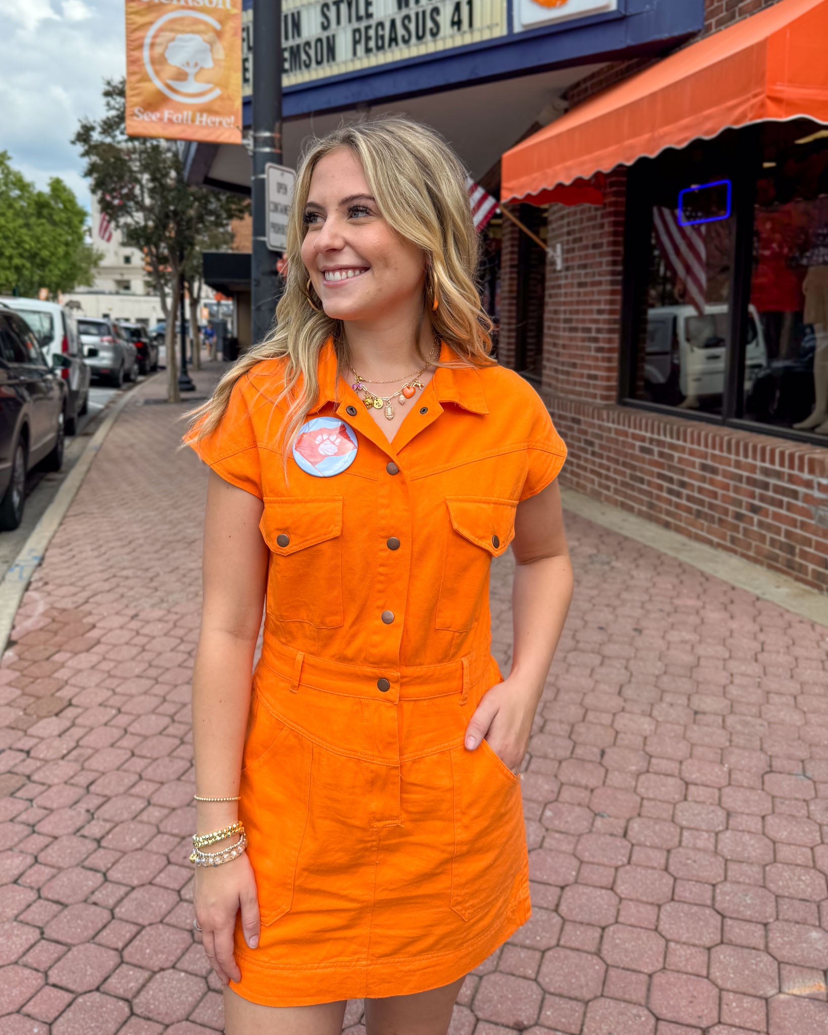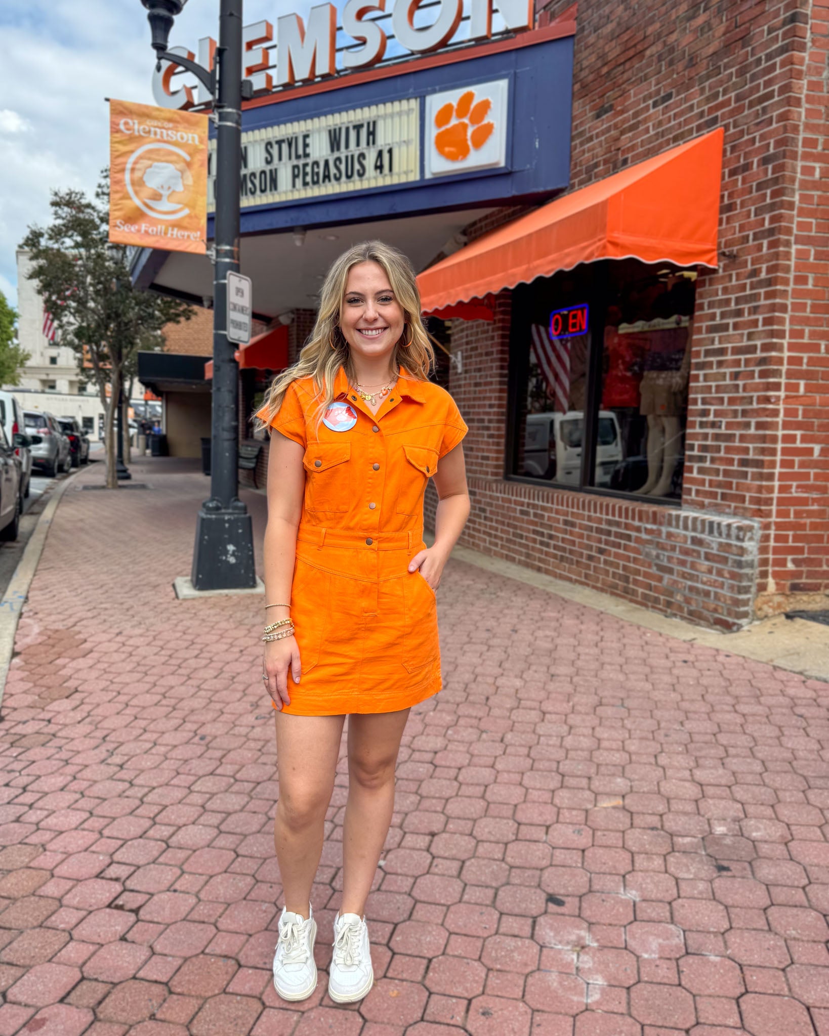 This dress is all the rave! Featuring utility pockets, not only are they adorable - but functional. There are so many ways to accessorize this dress this season. Add all of your game day jewelry, clear bag, and sneakers or boots to finish the look!