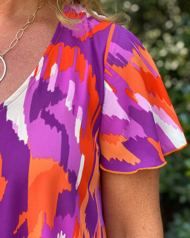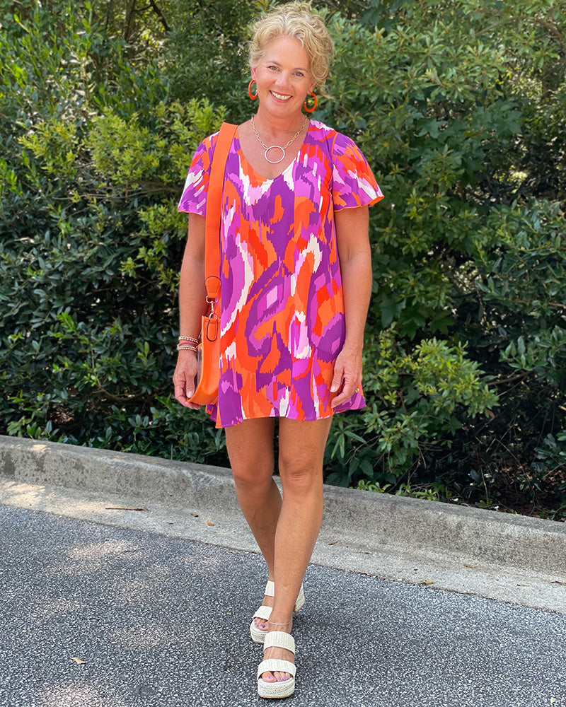 This dress is perfect for transitioning to the cooler months! The flutter sleeves are great for warm afternoons tailgating. Add a denim jacket and you're ready for a cool night game! Accessorize with a pair of orange hoops and a clear bag to complete your look!