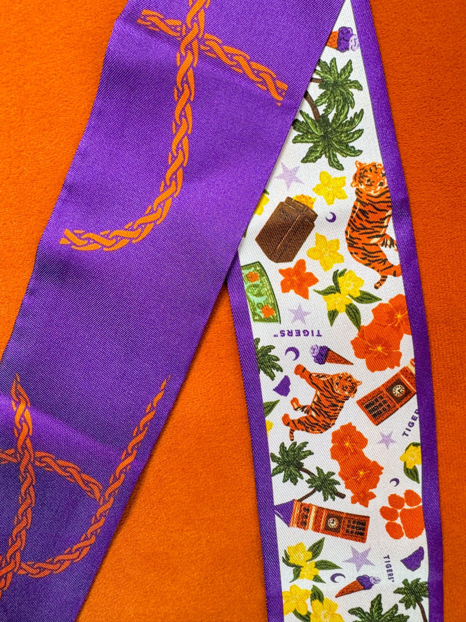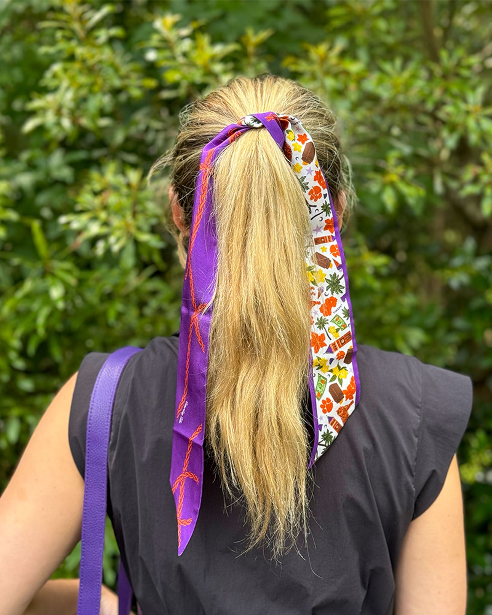Game day accessories doesn't stop at clothes, jewelry, and pins! This adorable twilly scarf can be worn many ways - in your hair, as a fun bracelet, or even a purse accessory! It is also has double the fun! One side is a fabulous Clemson floral print, and the other is an orange cable twist print! This scarf is fully licensed and features all the bests of Clemson!