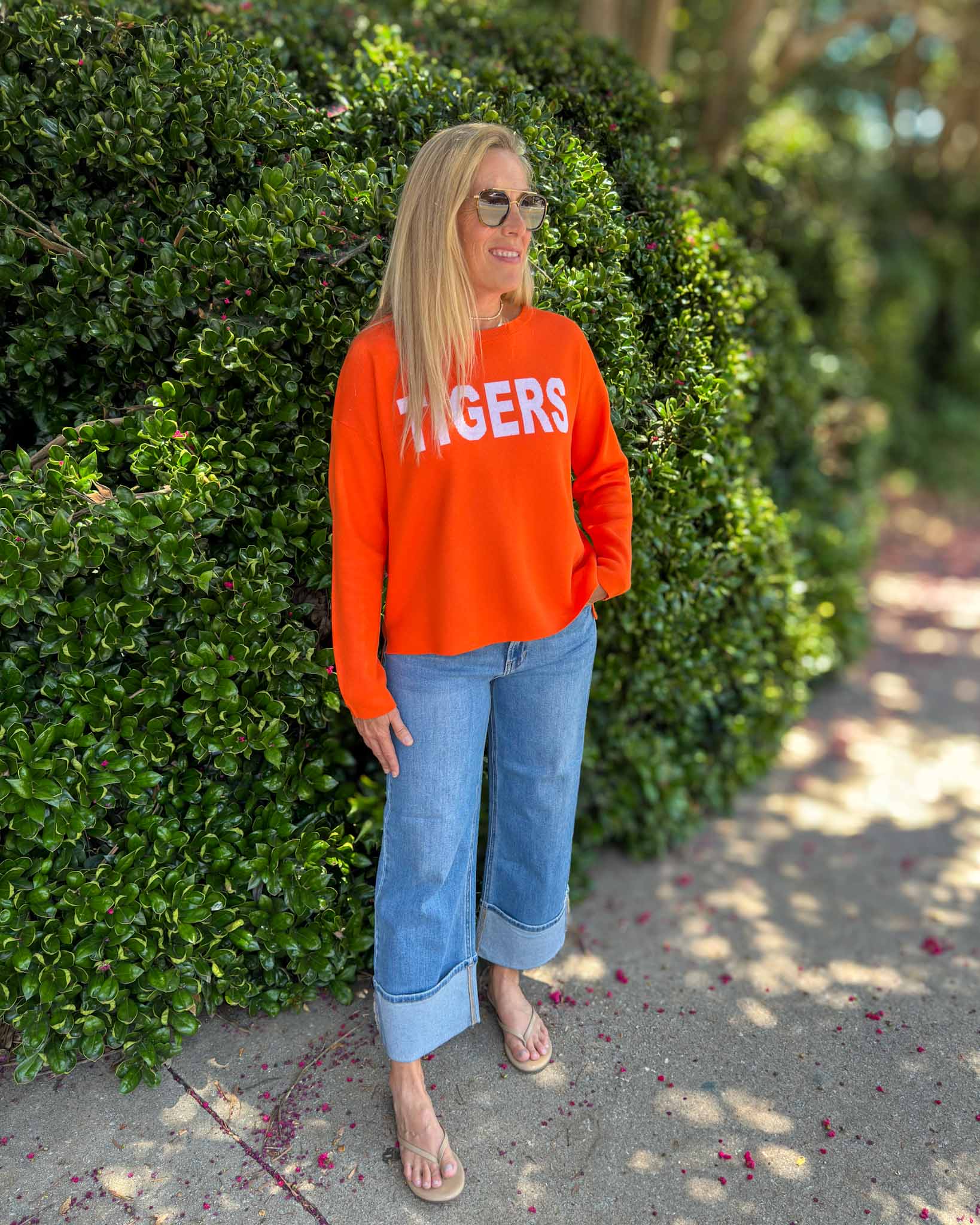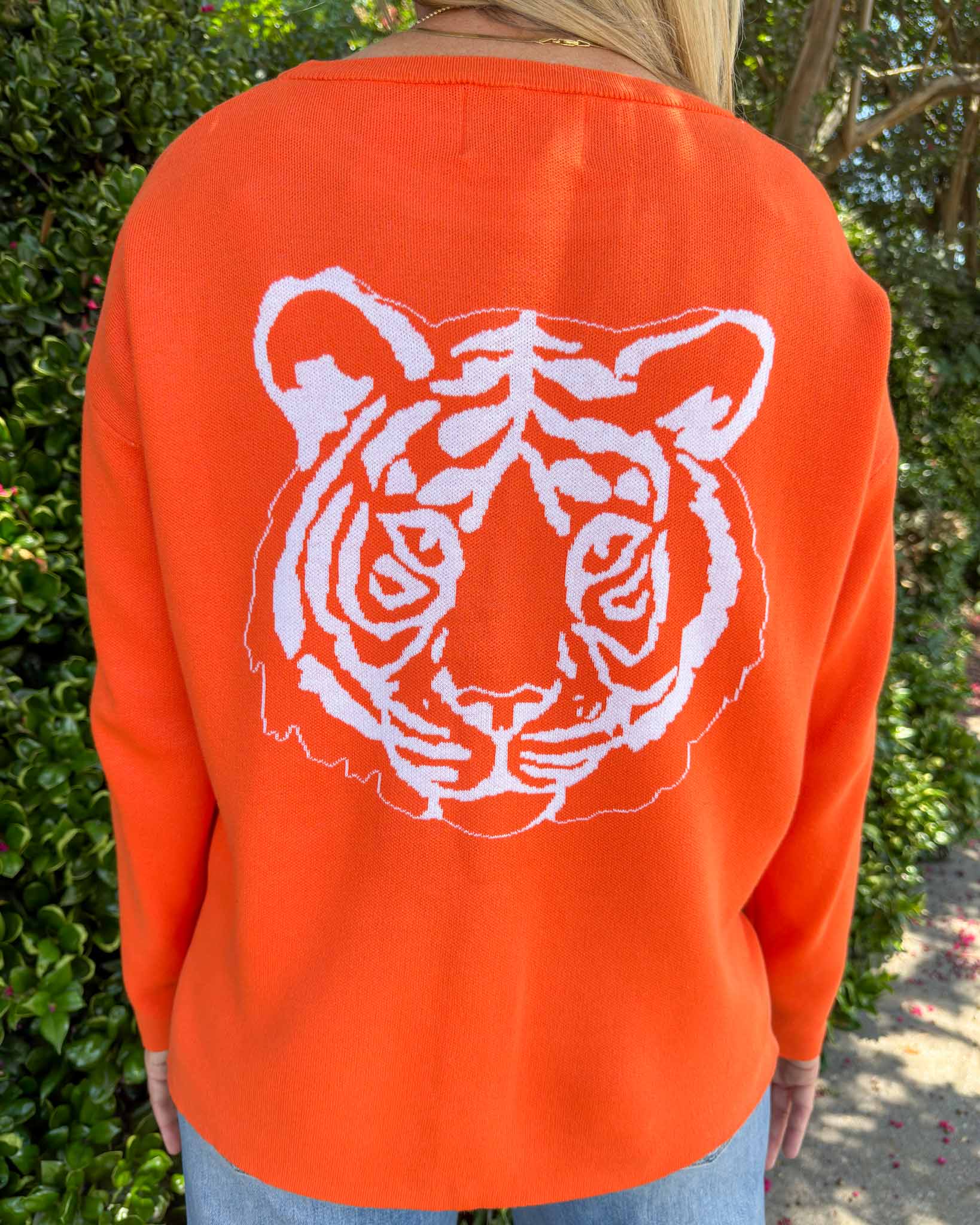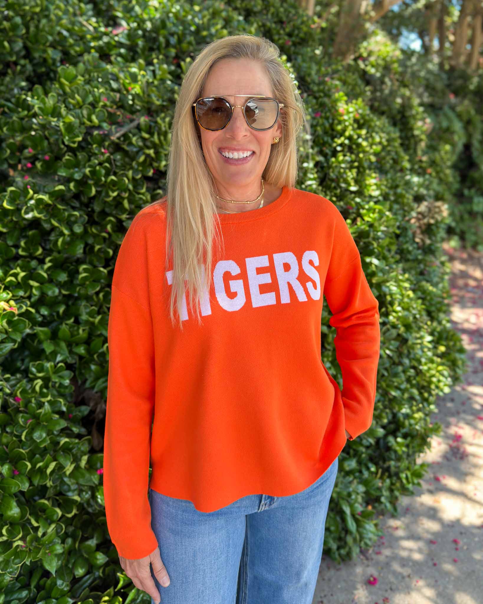 Show your Tiger pride in this lightweight game day sweater! Featuring bold "TIGERS" lettering on the front and a fierce tiger graphic on the back, this vibrant orange pullover is the perfect blend of comfy and spirited. Its breathable knit makes it ideal for warm Southern Saturdays or layering up for cooler fall tailgates. Effortless, eye-catching, and game-day ready!