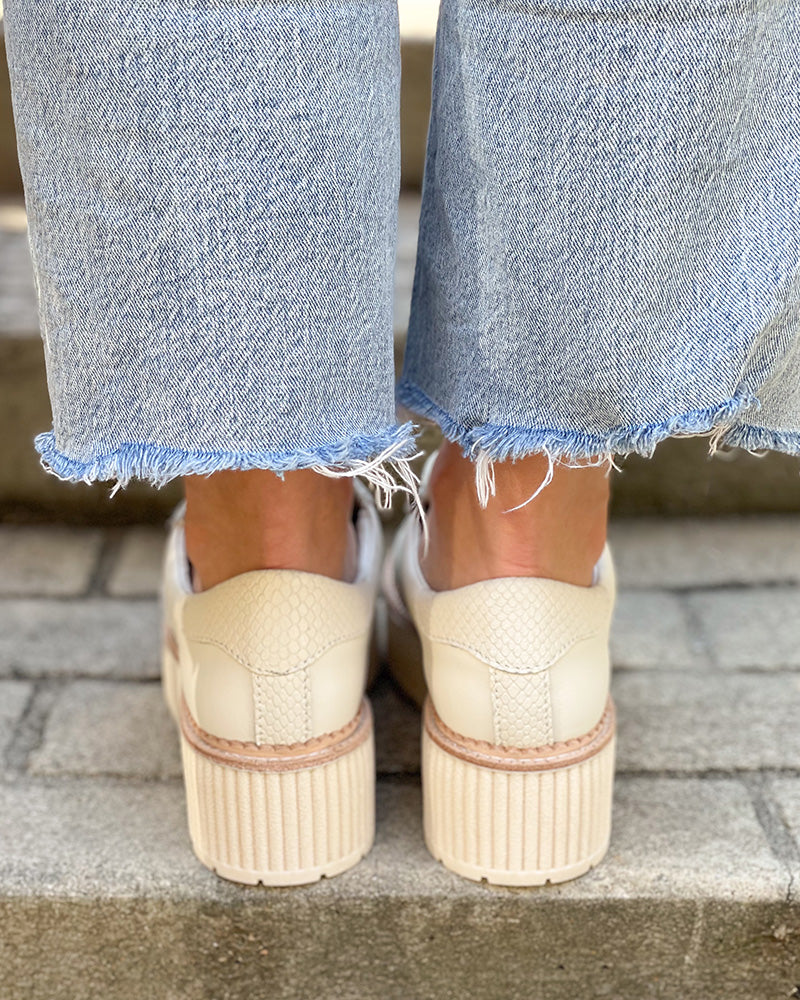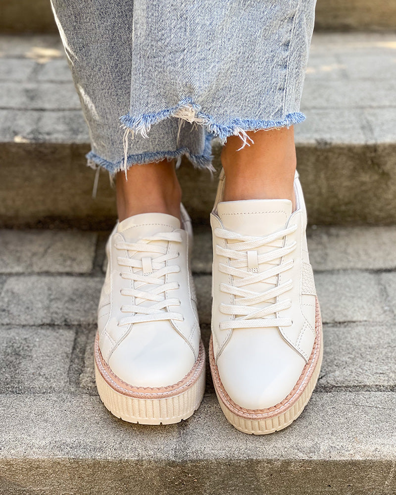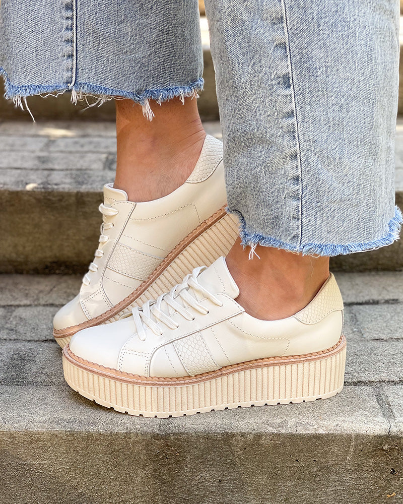 Put some pep in your step in the Dolce Vita Tiger Sneakers! With their soft white coloring and snakeskin detailing, these platform sneakers will become your new go-to! Wear with jeans or dresses, these sneakers will give you extra height while keeping you comfortable!