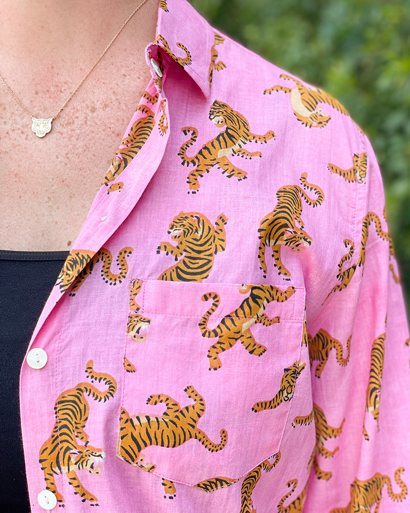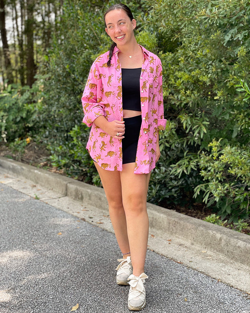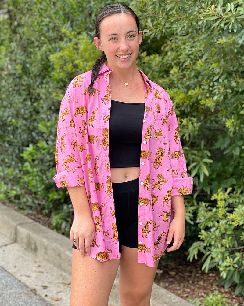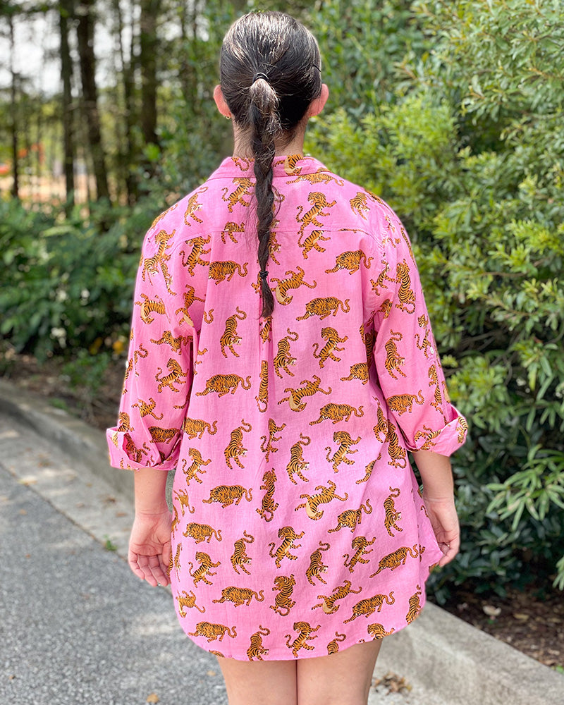 Add some pink to your tiger wardrobe! This top is so versatile- button it up or down, or pair it with a cute under shirt! And for our petite girlies, this top doubles as a cute dress paired with your favorite boots!