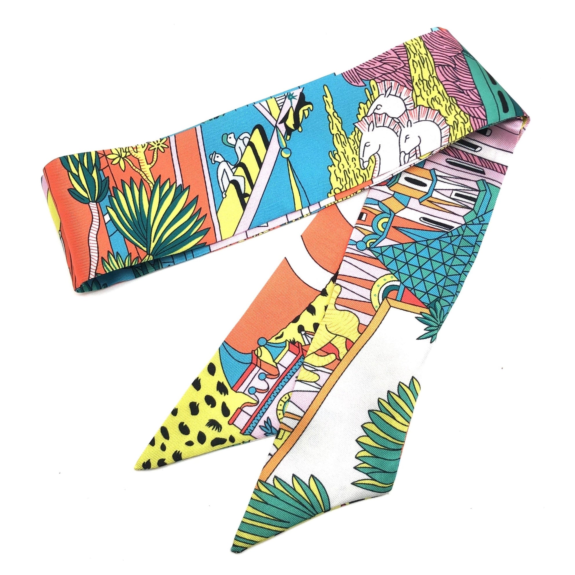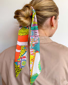 Add a splash of vibrant fun to your look with this jungle-inspired scarf, bursting with bold patterns, tropical colors, and playful animal illustrations. From lime greens to fiery corals and sunny yellows, this accessory is your go-to for instant personality.
