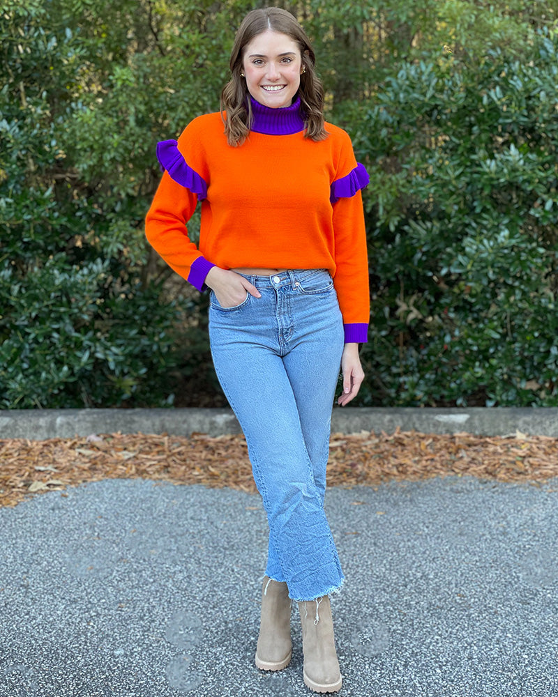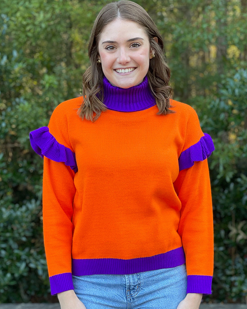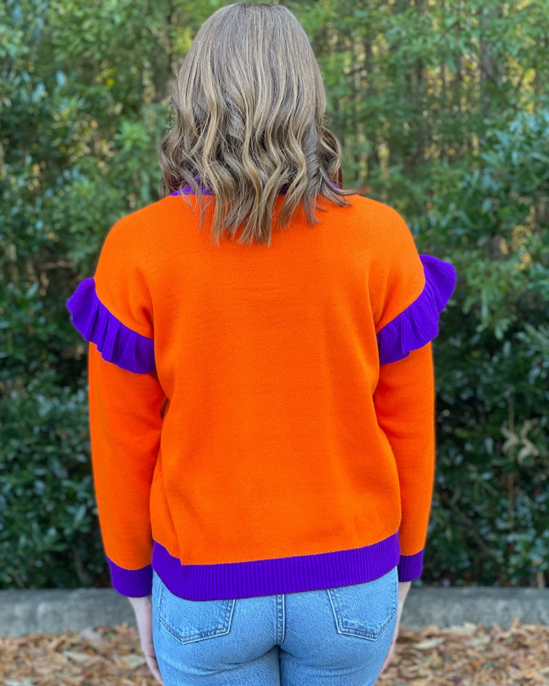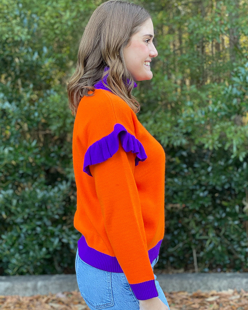 It doesn't get better than an orange and purple sweater with flutter sleeves! Perfect for football, basketball, or soccer games, you'll be the talk of the tailgate in this sweater!