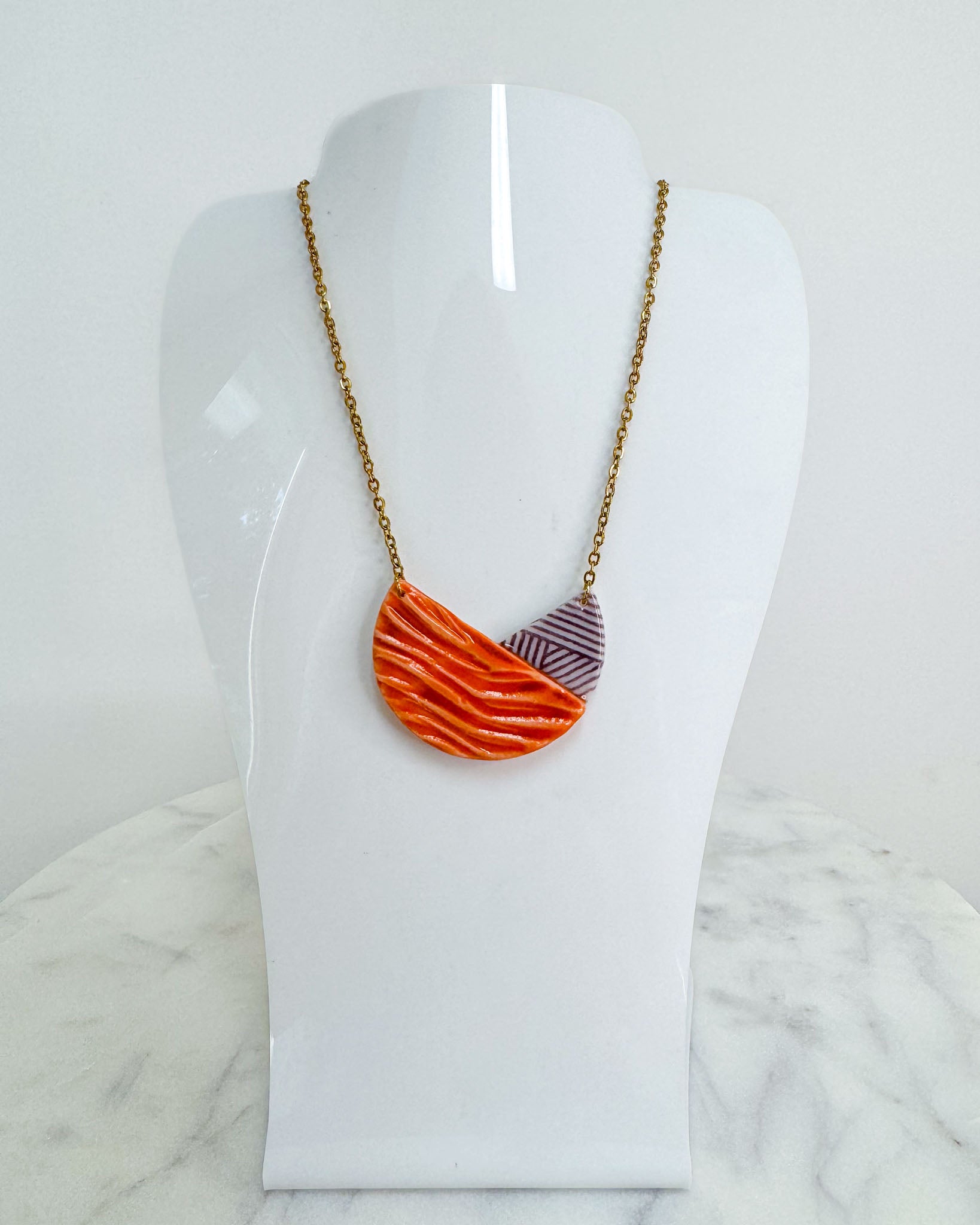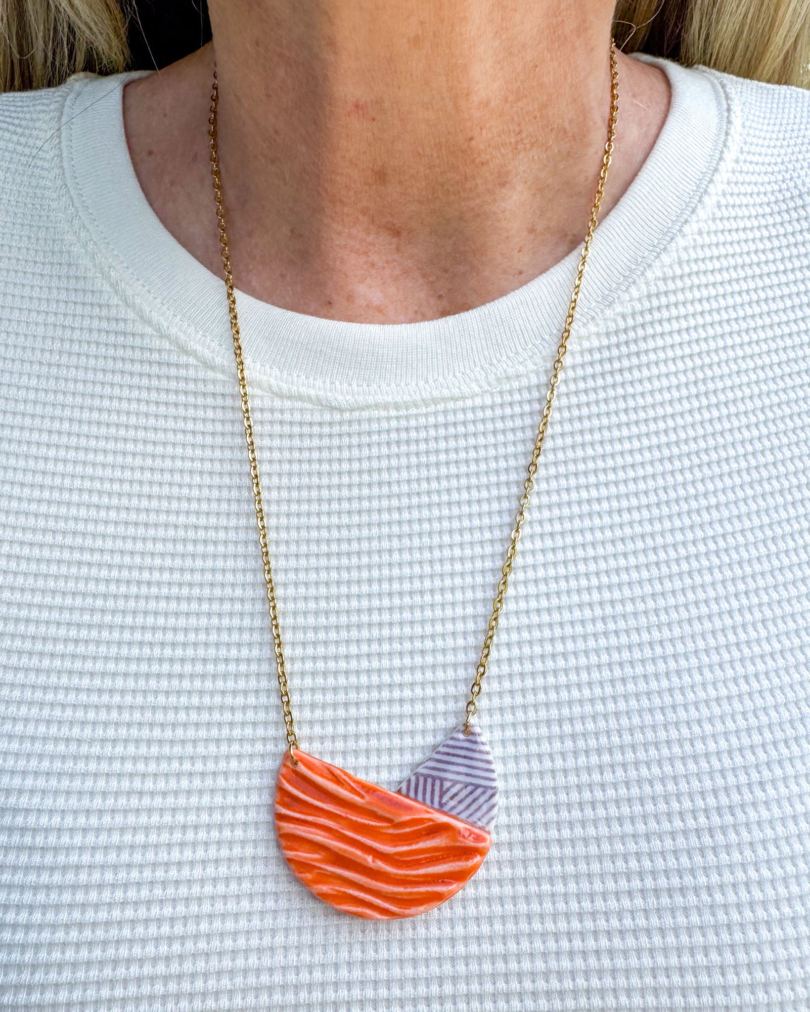 Statement necklace lovers! This will be one of your favorites this fall. With detailed texture and layering of the Orange & Purple geometric shapes, this necklace is bound to stand out. Any outfit is a win in our book this season paired with this necklace! The length is adjustable to wear as a mid-length or shorter necklace.