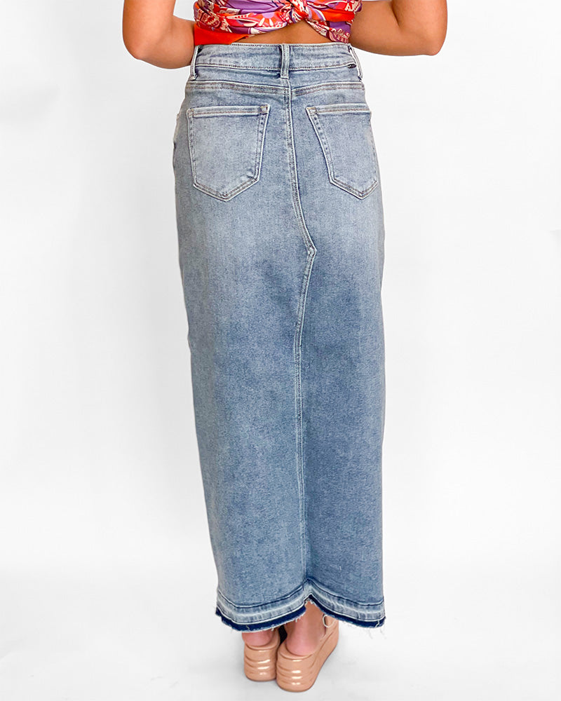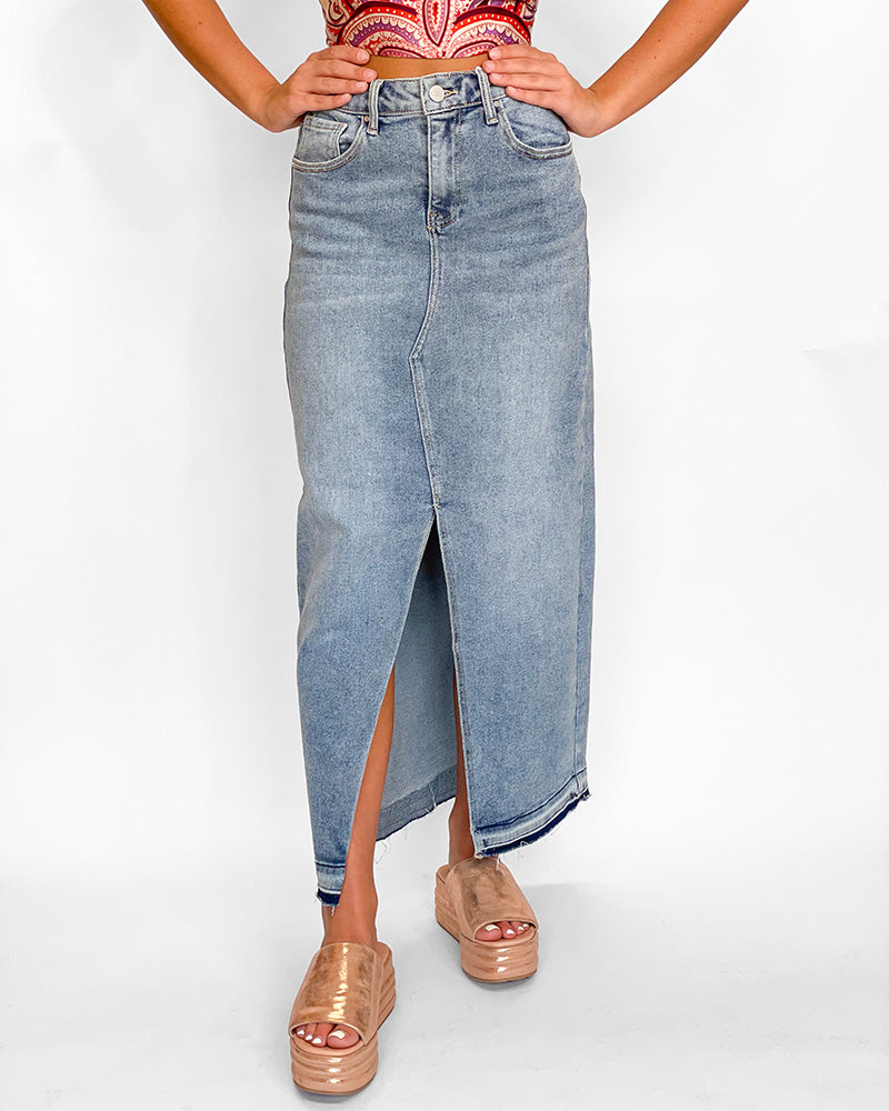 Summer concerts & events are calling- and this maxi skirt answered! Detailed with a darker denim hem and a fun front slit, there a ton of ways to style this skirt! Pair with wedges for a stylish, lively look!