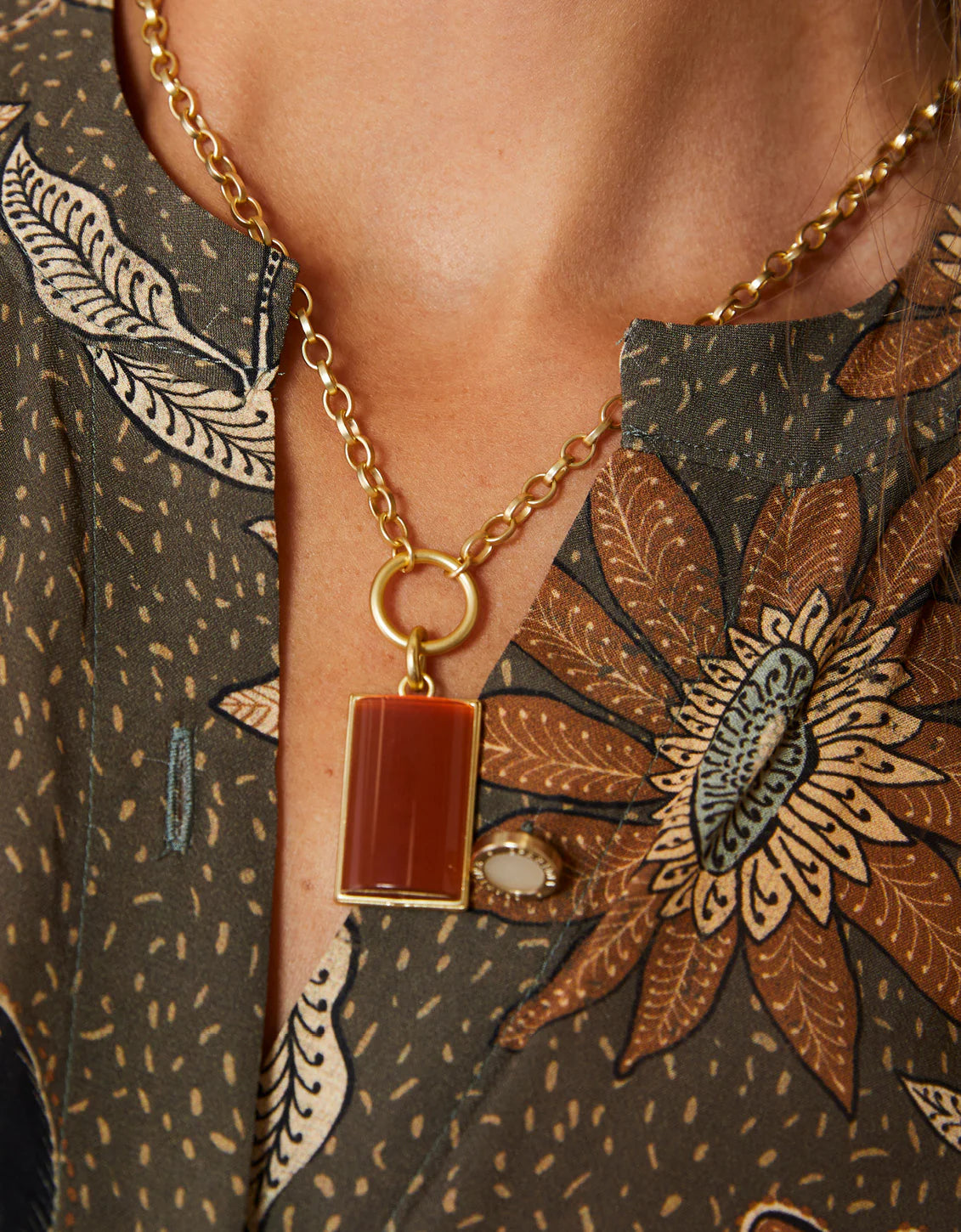 Add a punch of sunny shimmer to your next outfit with the Highlands Necklace. It is made with an optic sunstone glass pendant and 18kt matte gold plating.