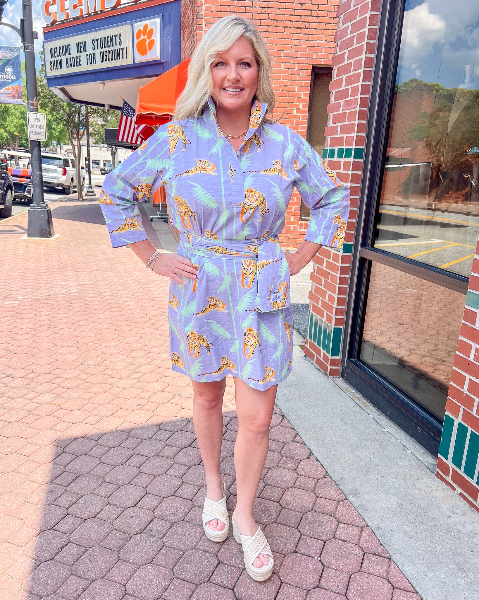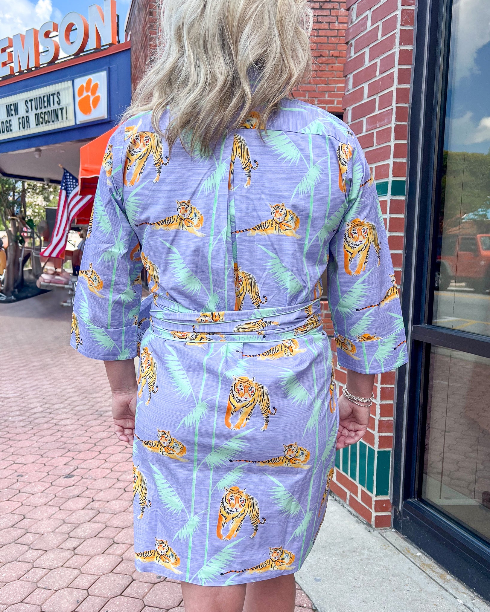If you are looking to step up your game day look, this is the dress for you! It can be worn with or without the tie belt. We love this dress for any Clemson event or a date night, even a girls brunch. You will look and feel special in this unique tiger dress.