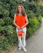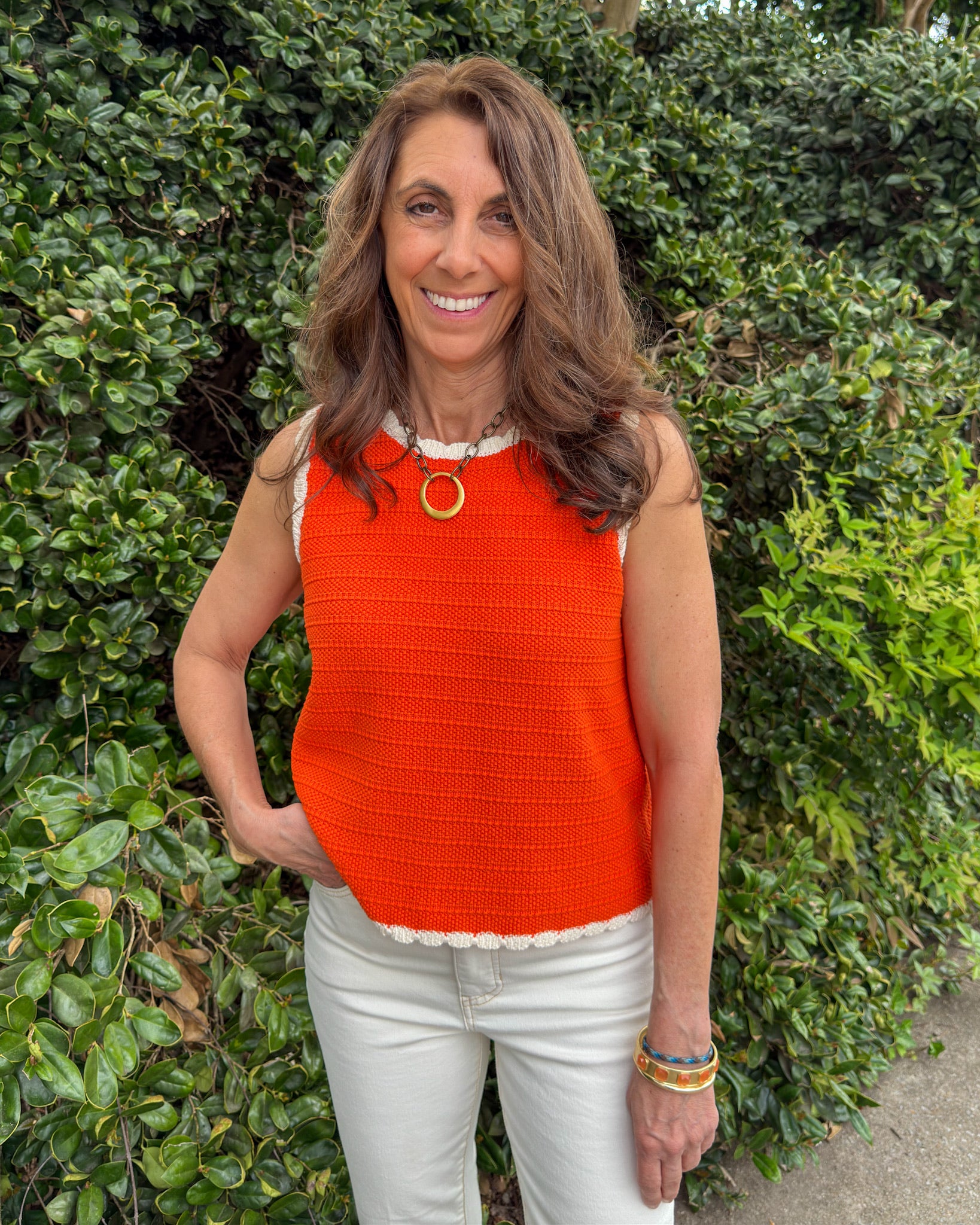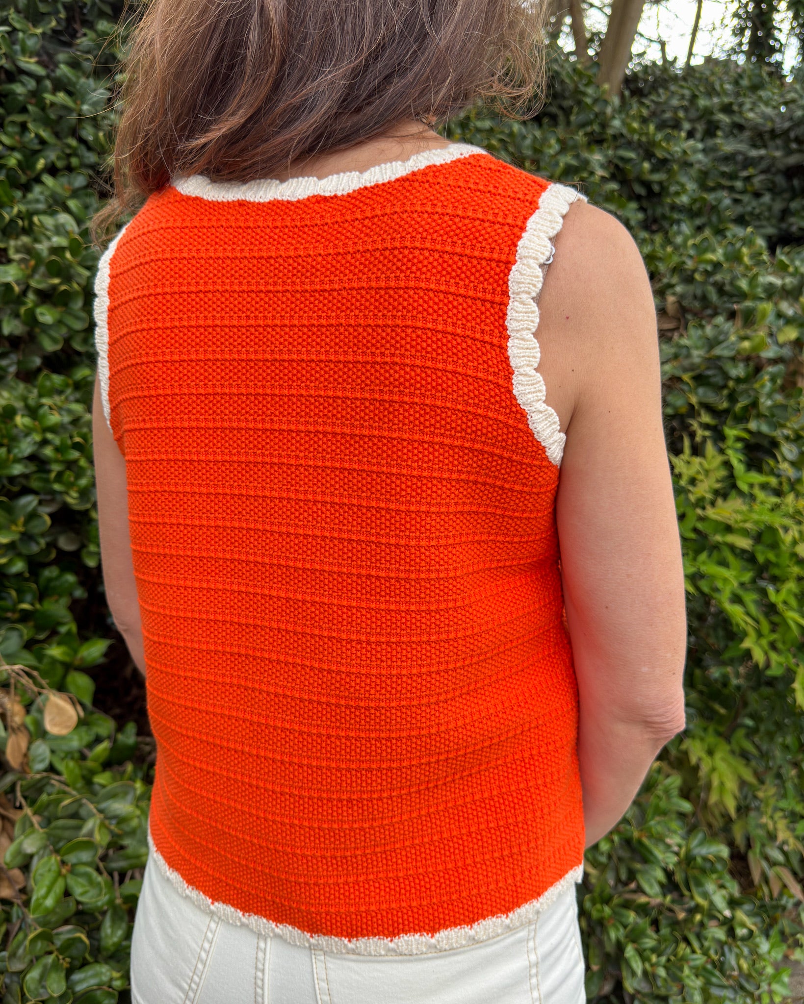 Bright, cheerful, and effortlessly chic, this sleeveless knit top is designed to make a statement. Featuring a vibrant orange hue with delicate contrast trim at the neckline and hem, it brings a fresh pop of color to any wardrobe. The textured knit adds subtle dimension, while the tailored fit flatters without feeling restrictive.