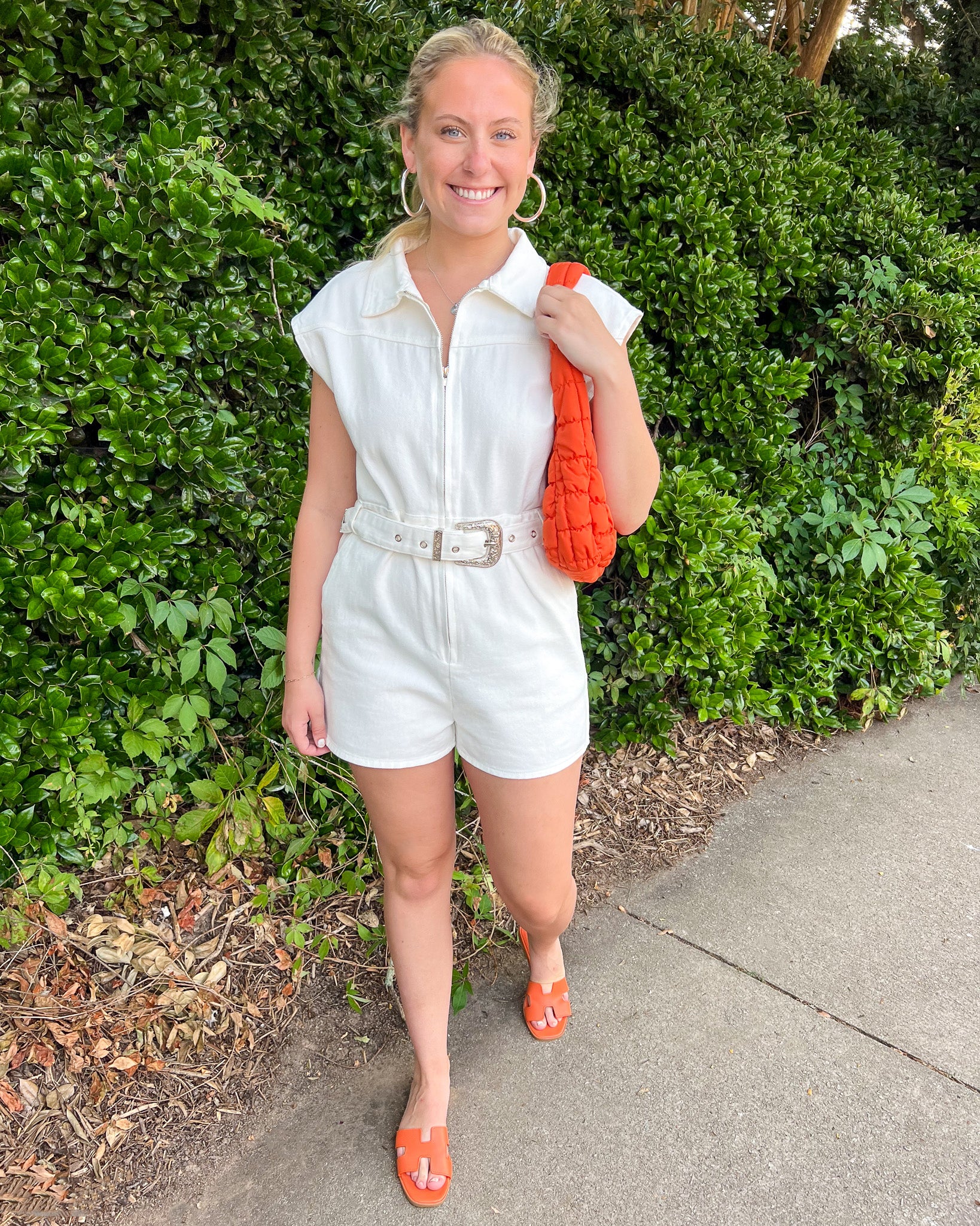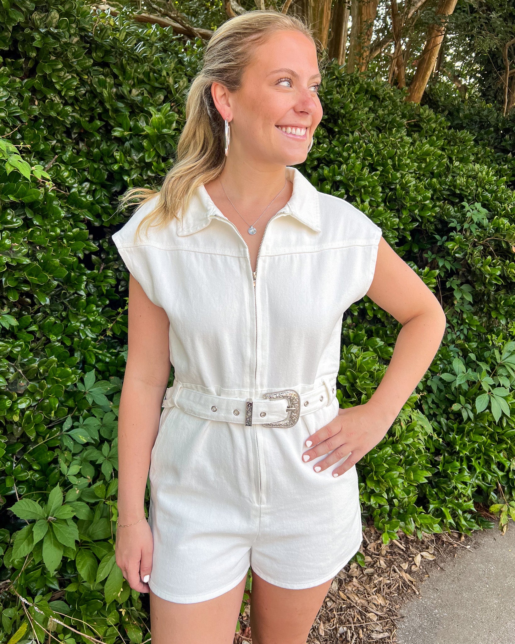 This denim romper is an outfit all in one! This is perfect for being on-the-go, lunch with friends, and anything in between. Accessorize with silver jewelry and a fun purse and you are ready to go!