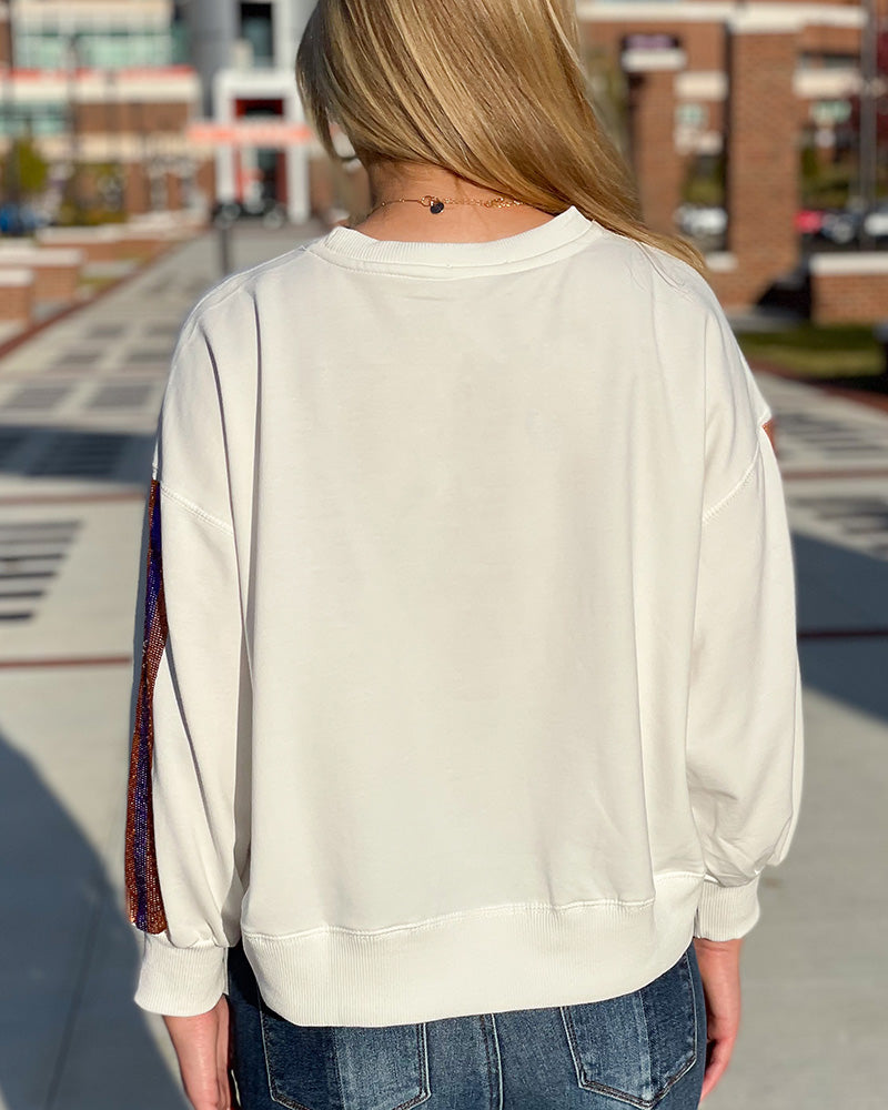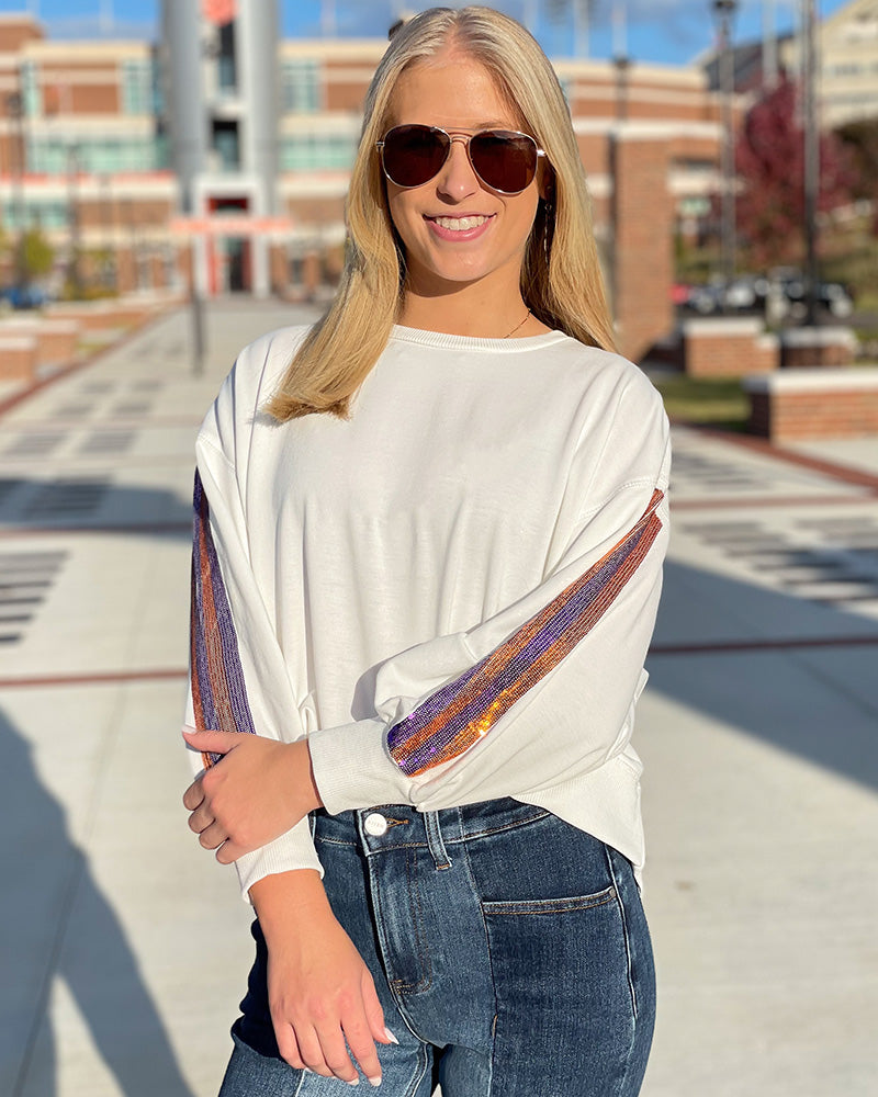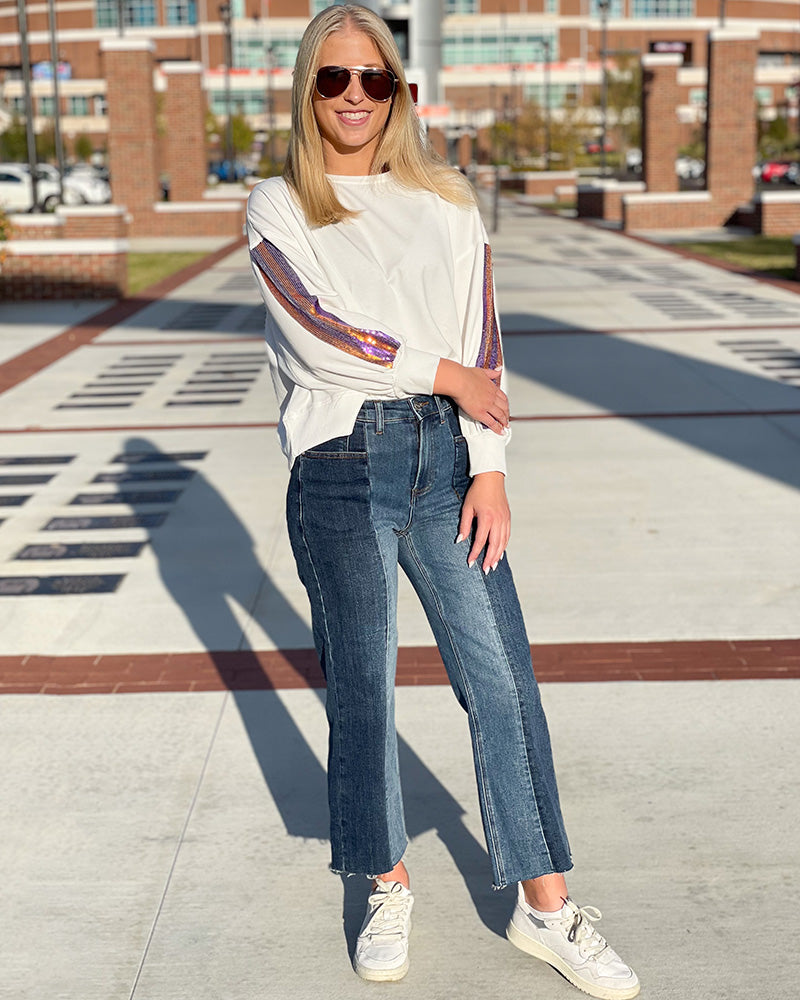 Sparkle wherever you go in this Mary Square Millie Sweatshirt! The trendy and fierce varsity stripe on the sleeves makes this the perfect sweatshirt for the girl with a bright personality!