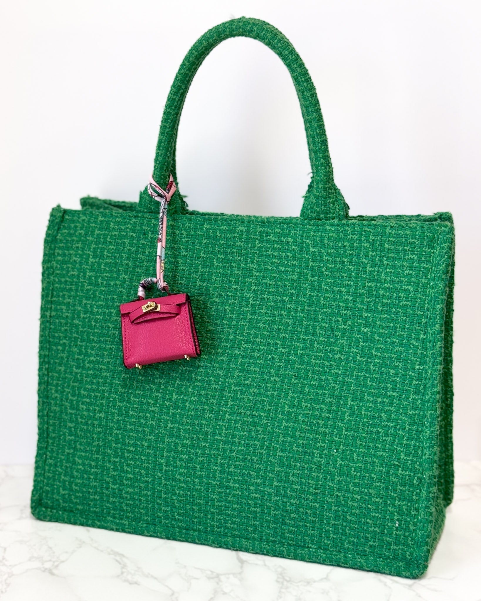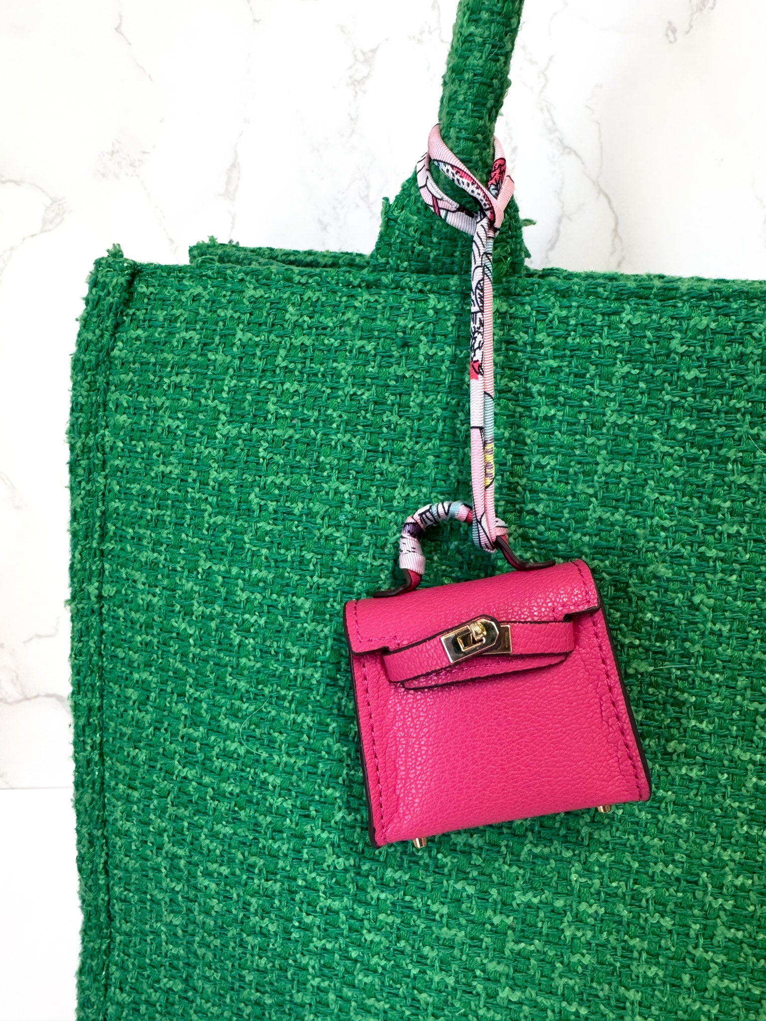 Add a pop of color and style to your bag with our mini purse bag charms! Each charm features a scarf loop, making it easy to attach to your purse handle for a fun and personalized touch. Available in three vibrant colors—hot pink, light pink, and green—these charming accessories are the perfect way to elevate your bag with a hint of flair and personality.