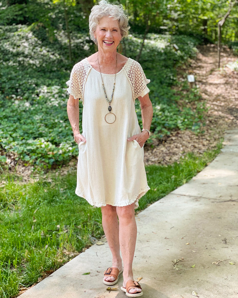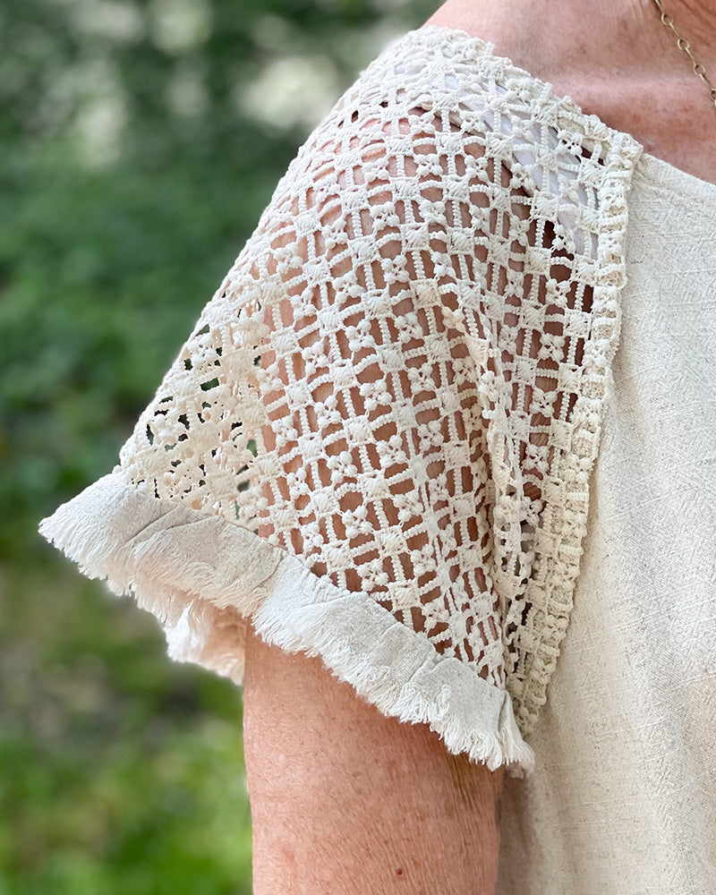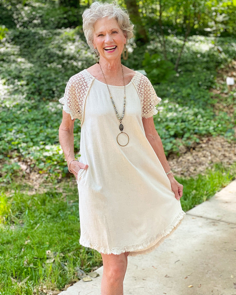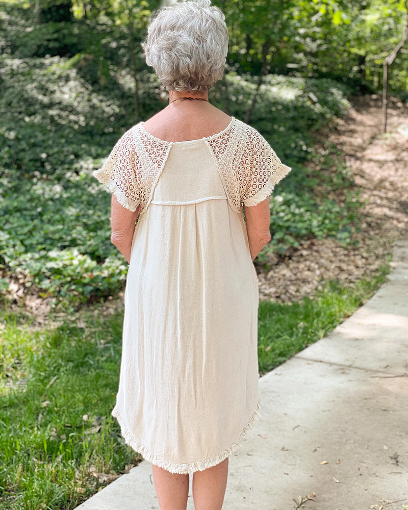 Classic linen with a twist! The crochet details on the sleeves of this flattering dress along with the frayed hem take it up a notch! Add a statement necklace, and your whole look is done!
