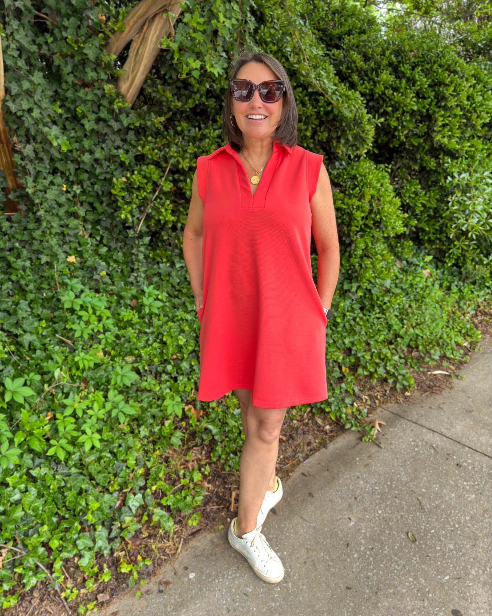 Effortlessly chic and endlessly versatile, this rust-colored sleeveless dress is your new go-to for warm-weather style. Featuring a structured collar and flattering V-neckline, it blends polished details with a relaxed silhouette for the perfect balance of comfort and sophistication. Dress it up with wedges or keep it casual with sneakers—either way, this look is a total win.