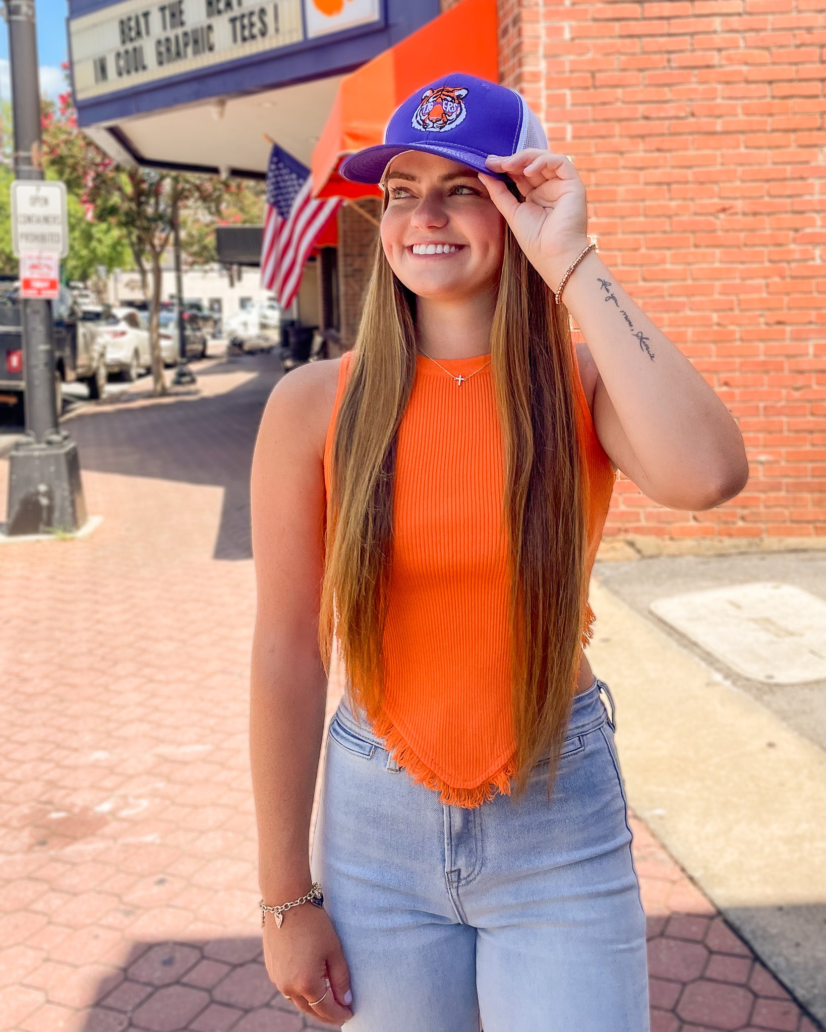 Calling all orange lovers! We have you covered this season with this fun tassel hem tank to spice up your wardrobe. This V-line cut across the front creates a flattering waist, pair with your favorite jean shorts and sneakers to finish the look!