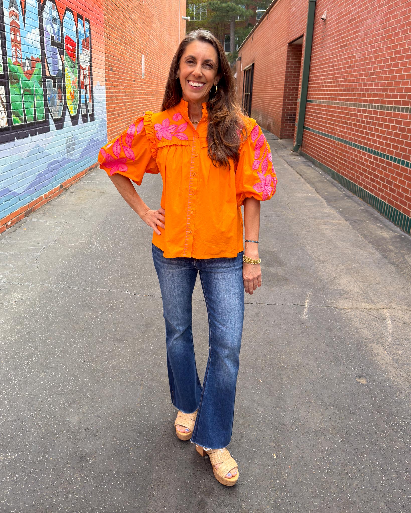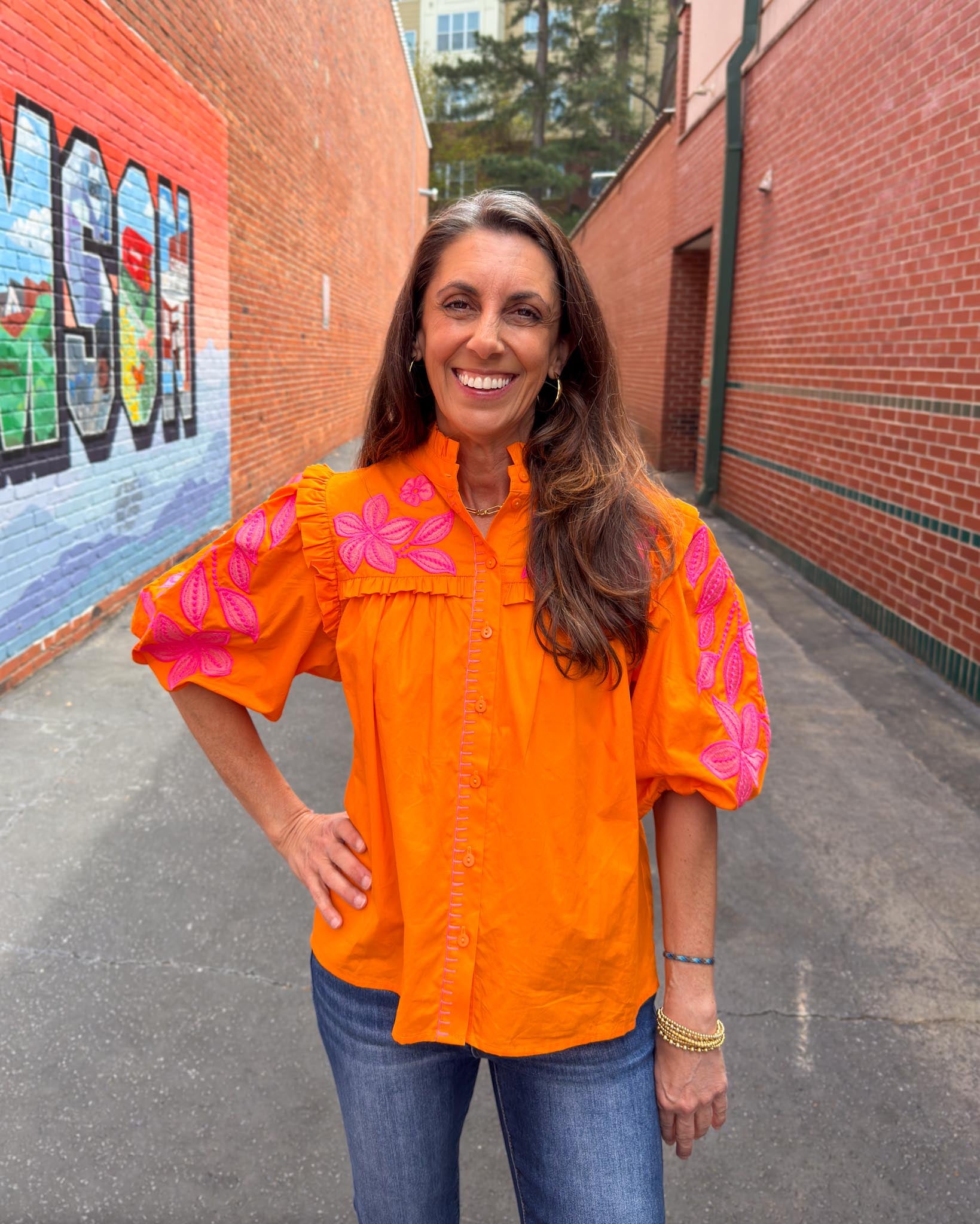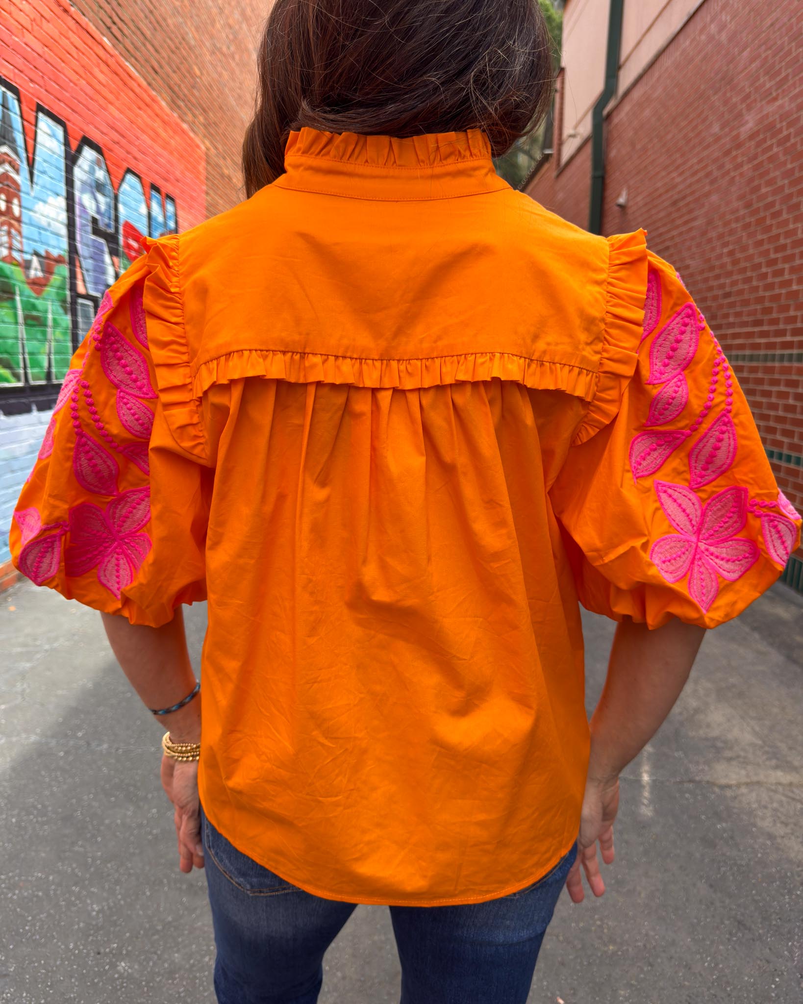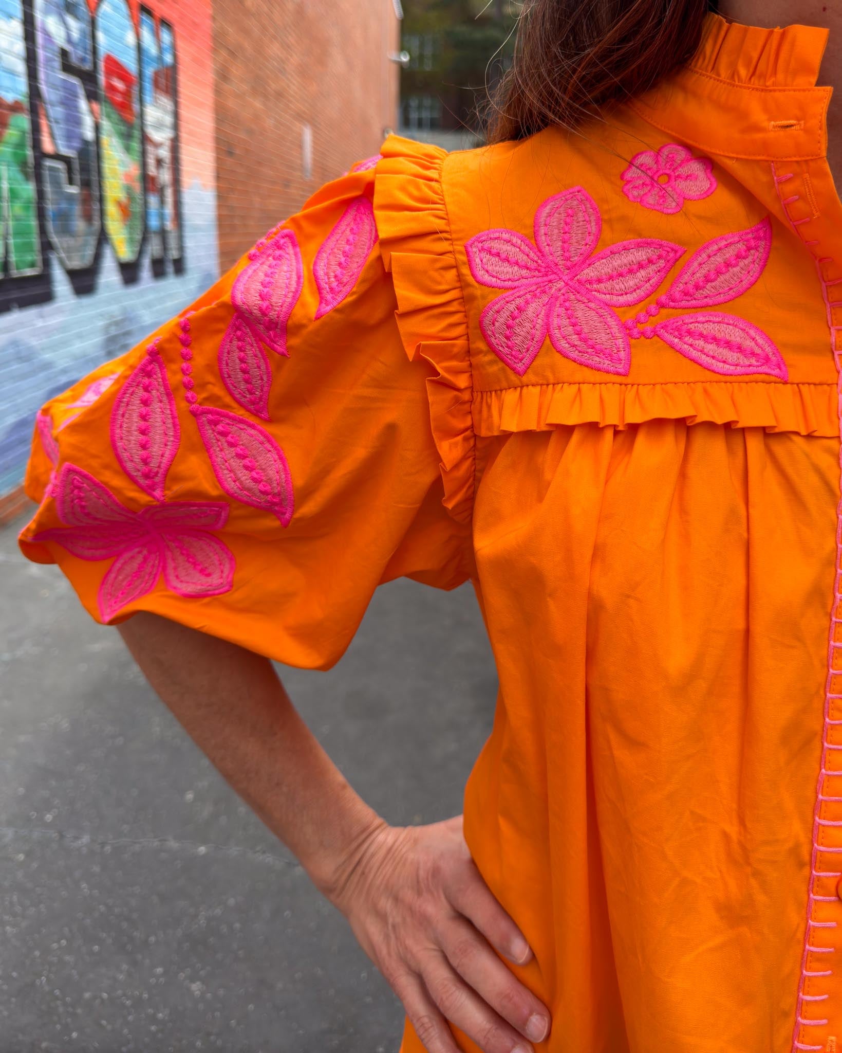 This top is giving us all of the fun tropical vibes, with a touch of Tiger spirit! The embroidery detailing adds the sweetest feminine touch to this classic poplin cut. We are loving how this pairs with white denim, accessorize with our Every Day Jewlery!