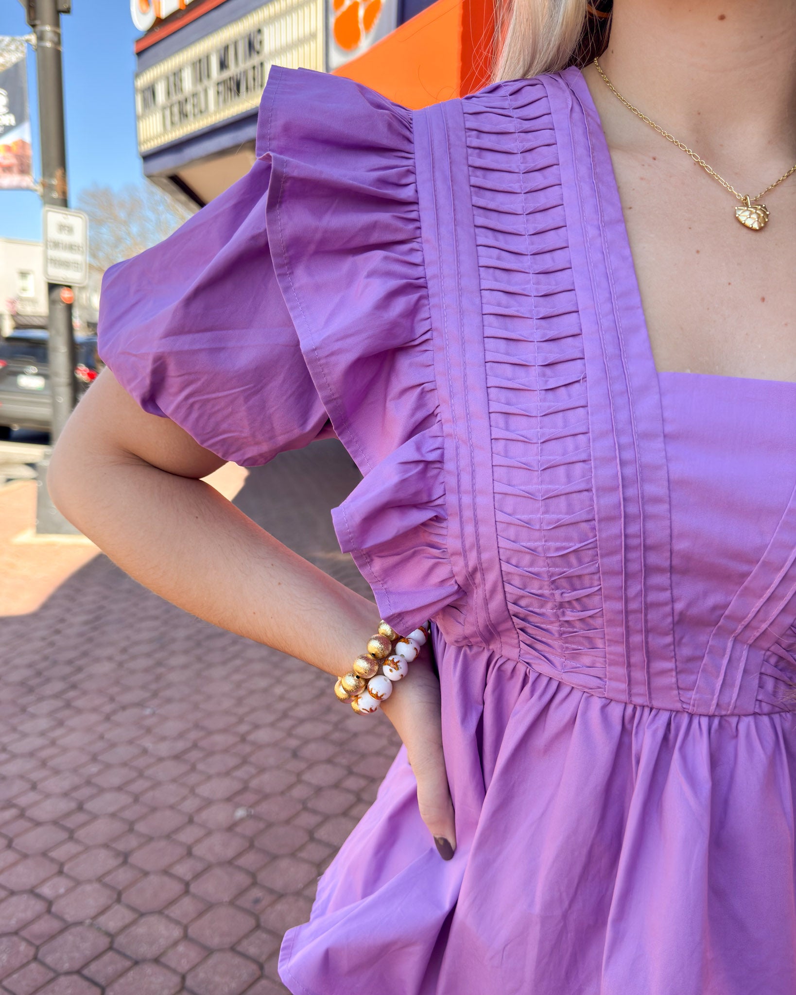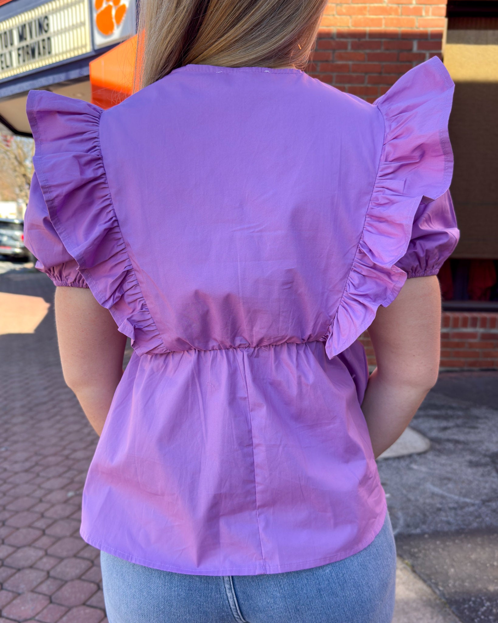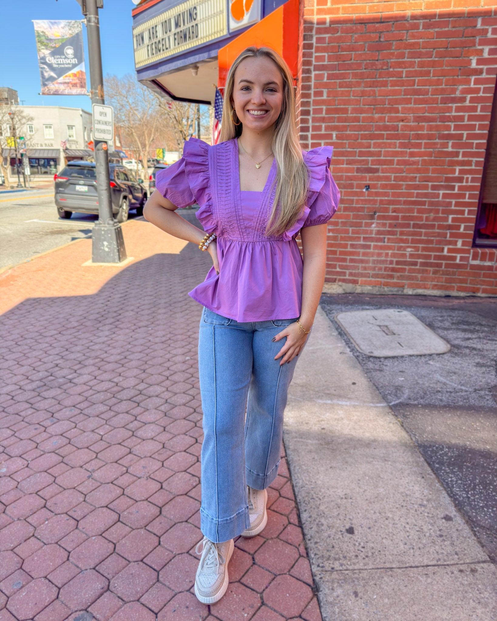 This elegant purple flutter sleeve top is the perfect blend of sophistication and comfort, making it an ideal choice for both work and special events. The flutter sleeves add a soft, feminine touch, creating graceful movement with every step. Its purple hue brings a refreshing pop of color, perfect for springtime styling—pair it effortlessly with tailored trousers for the office or a sleek skirt for an evening out.