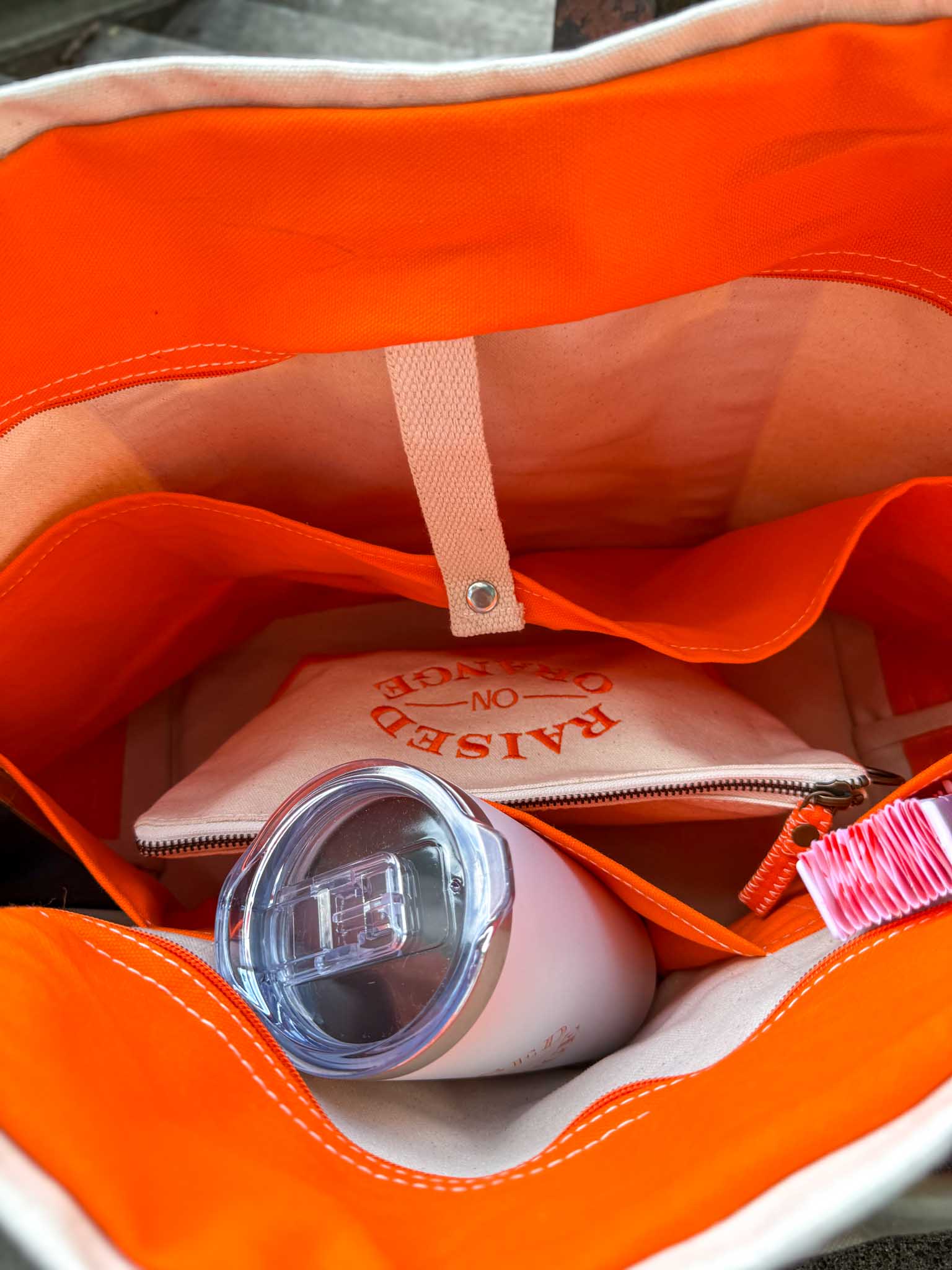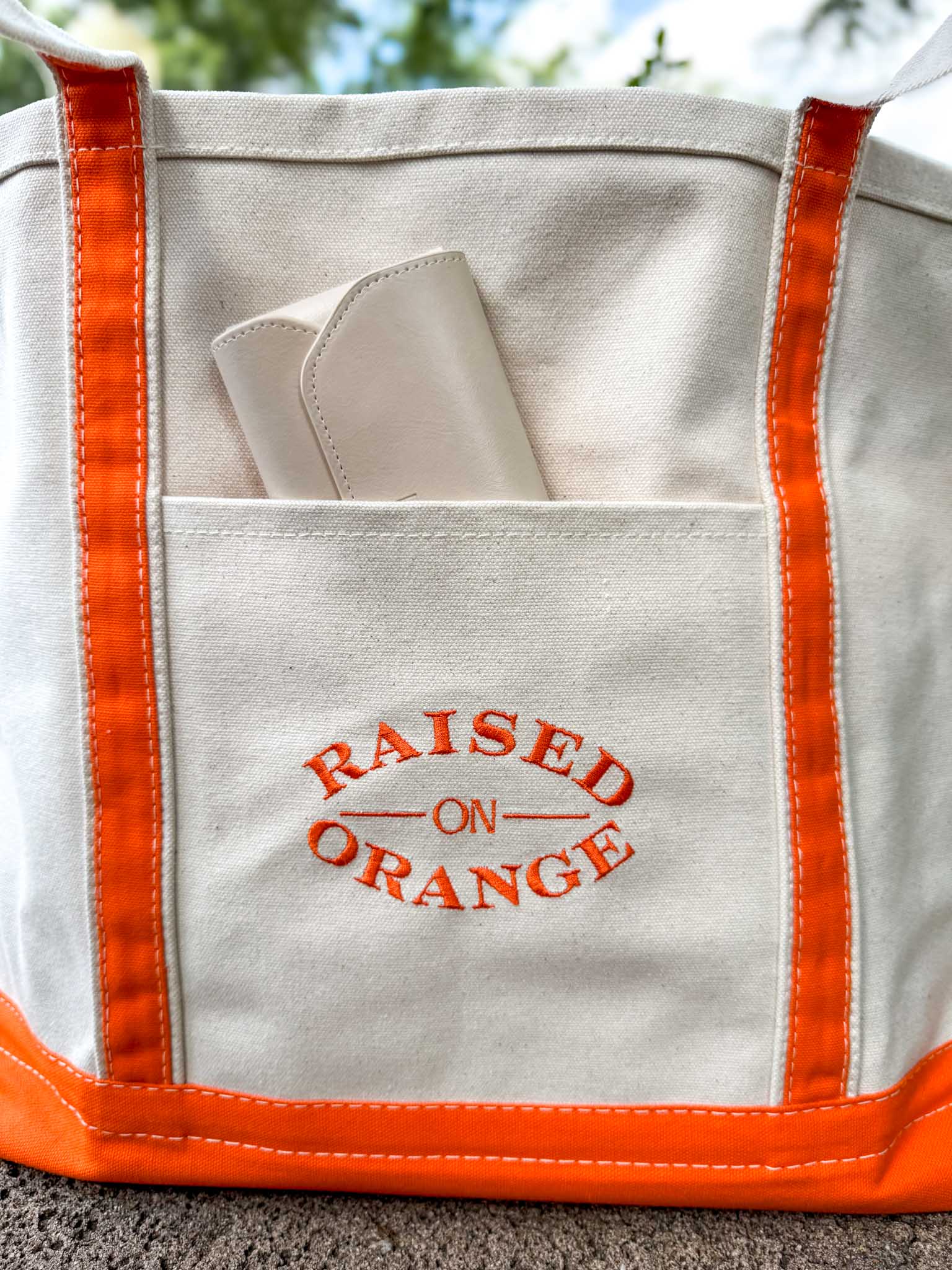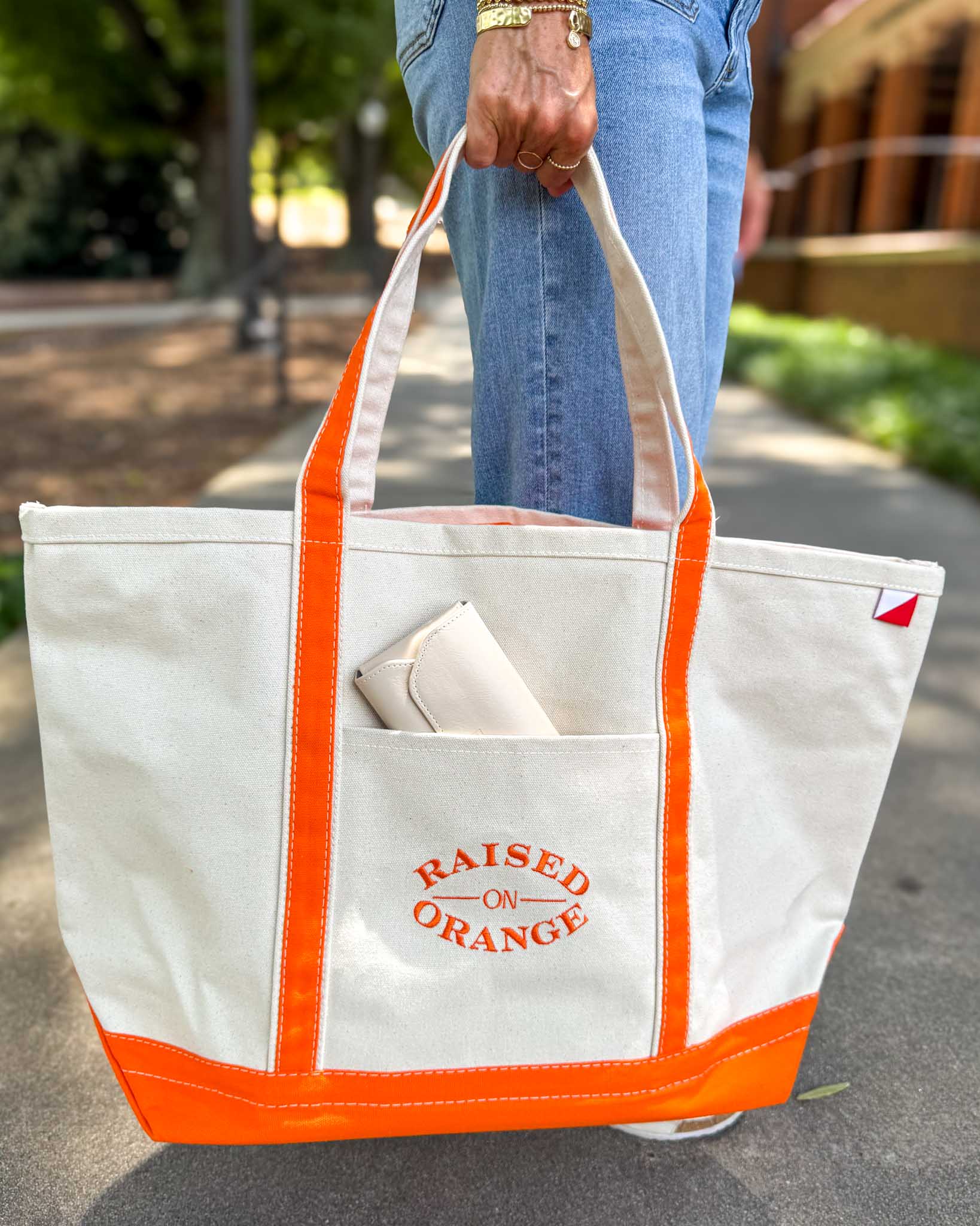 Say hello to your new tailgate essential: the Raised on Orange Tote! This bold, bright bag is designed in-house by True Orange, this exclusive logo is a one-of-a-kind creation you won’t find anywhere else. Whether you're looking to commemorate your time at Clemson or celebrating a new Tiger this tote lets everyone know where your roots run deep—right here in Tiger Town.