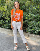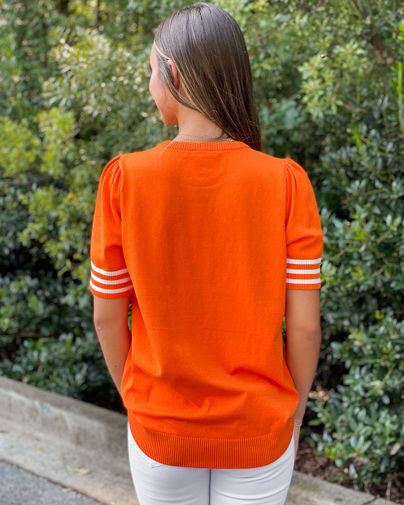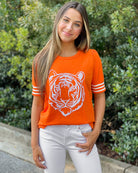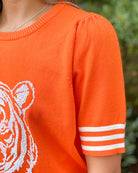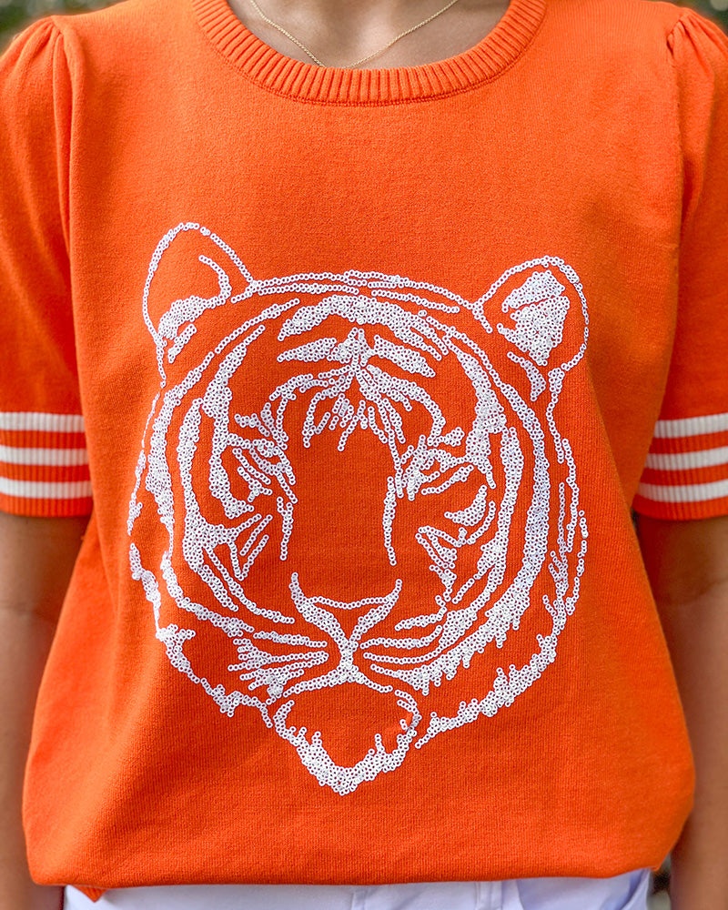 Show your spirit in this Ready to Roar Short Sleeve Sweater Top! With a white sequin tiger face and varsity stripes on the sleeves, this top goes great with jeans or leggings!