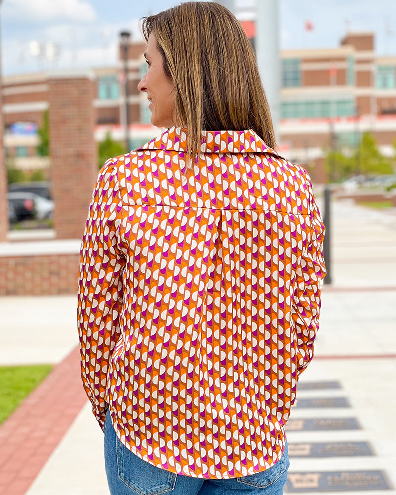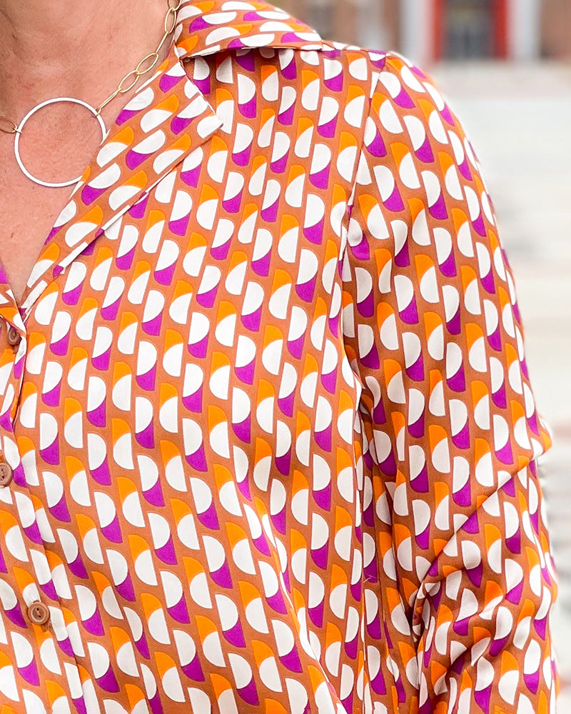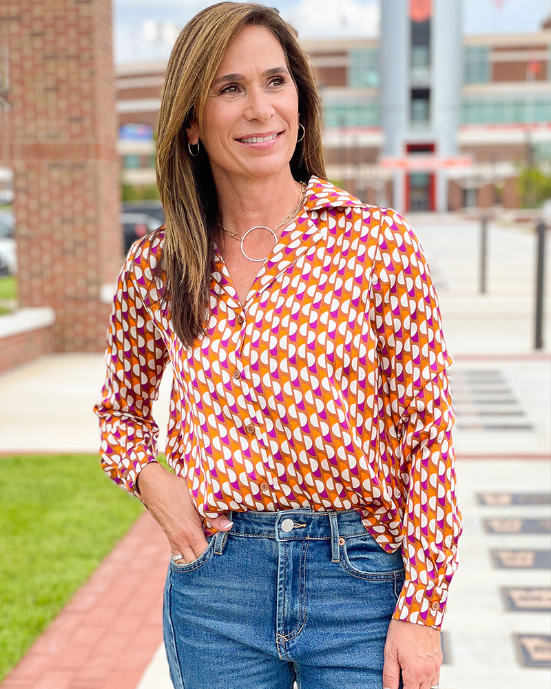 Fun, funky, and fabulous! We are loving this Retro Print Satin Blouse. It's a silky smooth material that will keep you cool and feeling like a million bucks.
