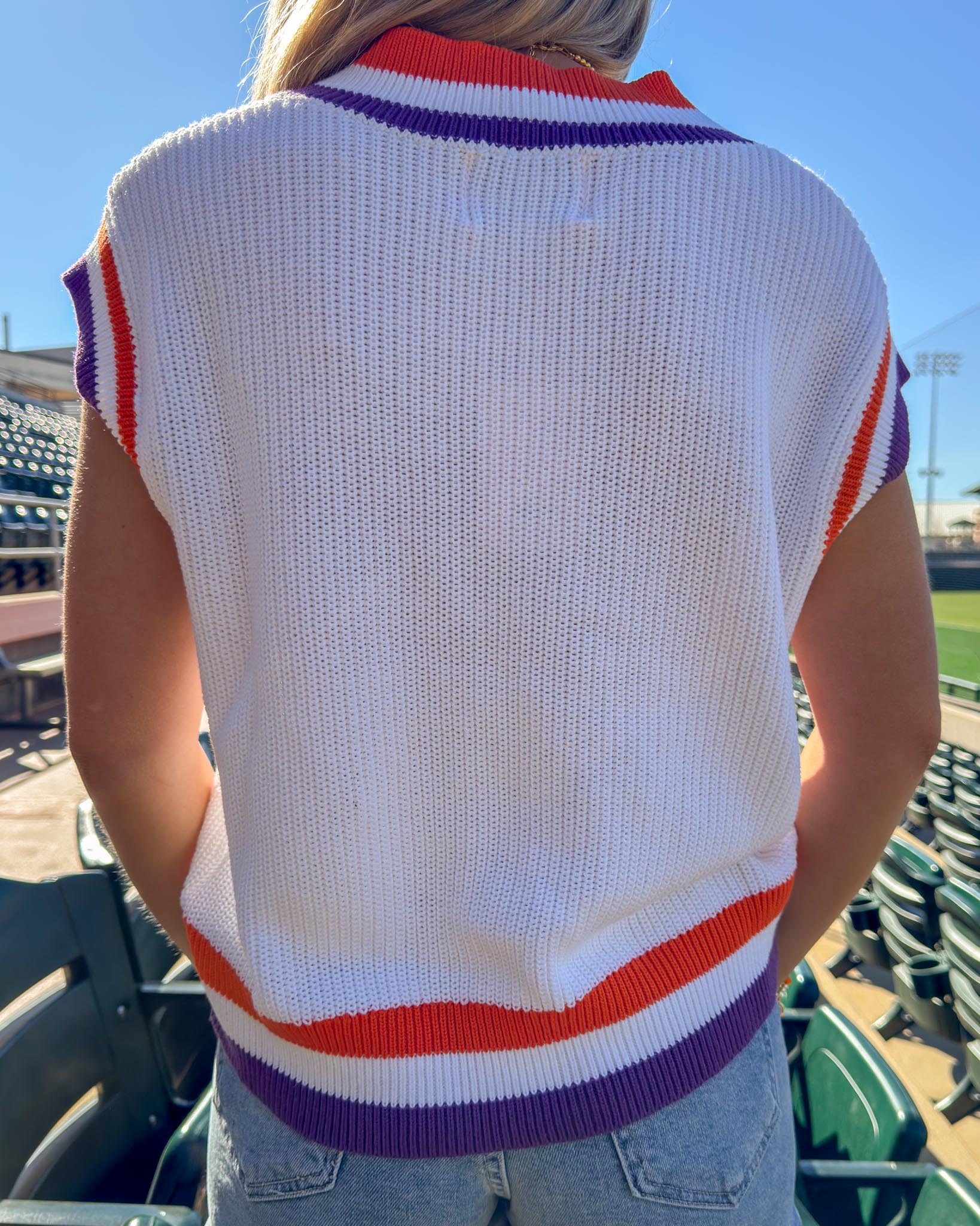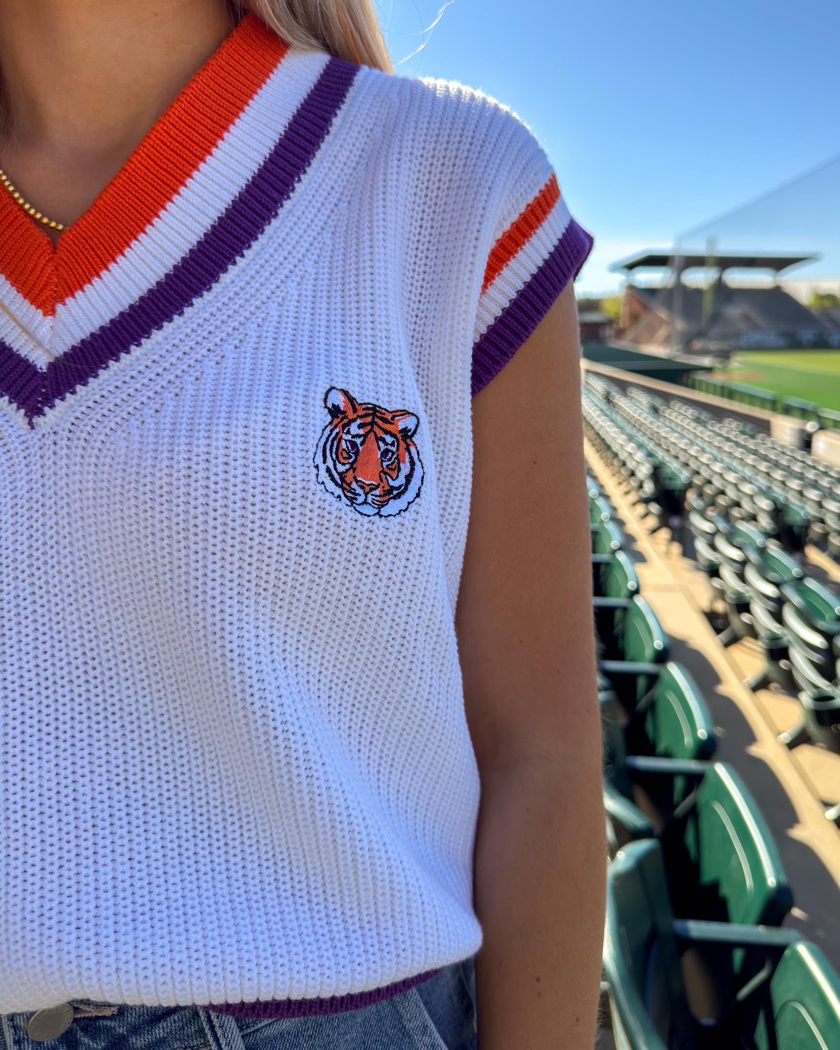 Stay classic and stylish with this sweater vest, featuring our signature tiger design and iconic Clemson colors. Crafted for both comfort and school pride, this vest is perfect for game days, alumni events, or everyday wear. Made with premium-quality fabric, it offers a stylish fit that layers effortlessly over your favorite shirt. Whether you're cheering from the stands or strolling across campus, this sweater vest lets you represent Clemson with timeless flair!