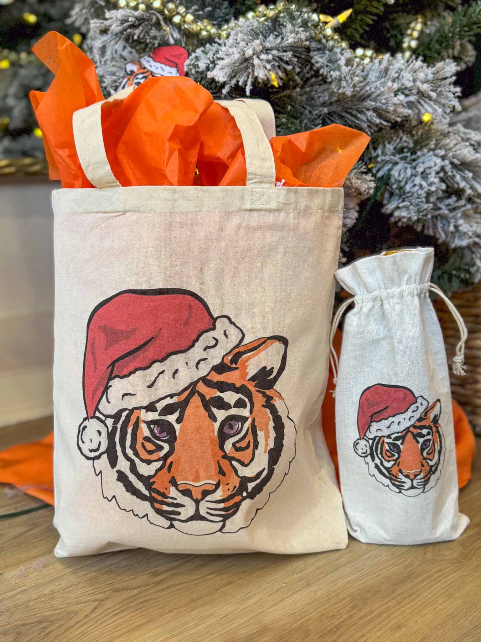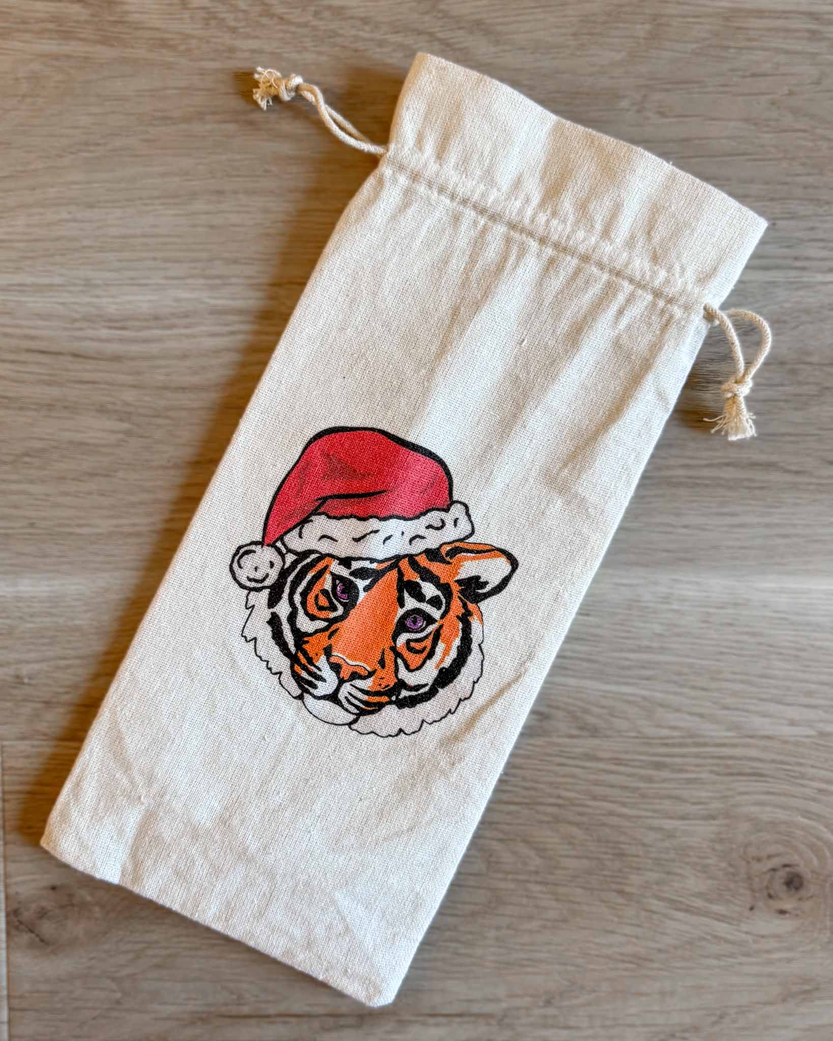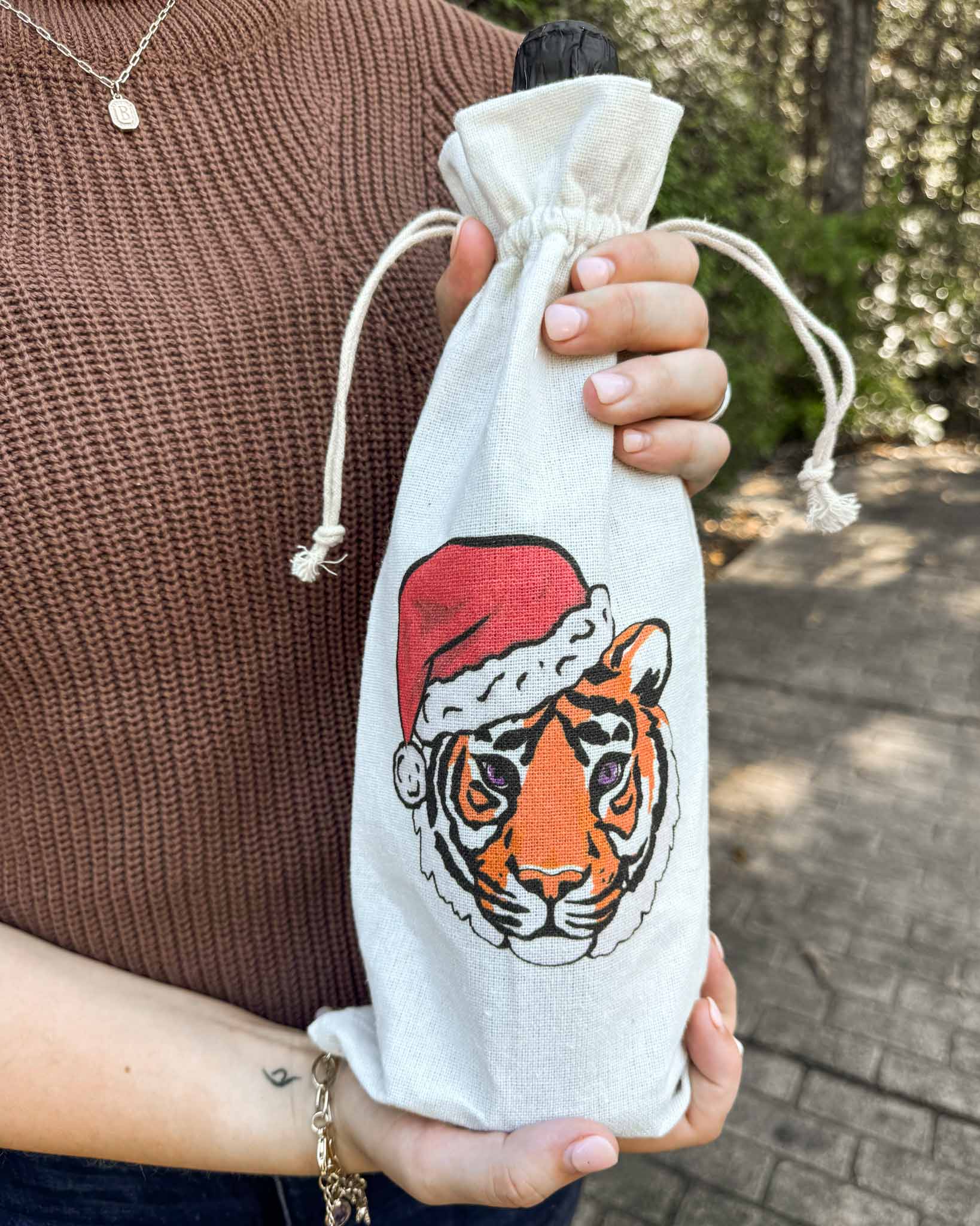 What is better than a gift of Tiger cheer around the holidays? This is the perfect gift to bring to all of the fun holiday events you are attending this season! This fun wine bag features our exclusive signature tiger by Cherry Day Art. Whether you have an event in mind, or like to stock up on gifts for the holidays - this one is for you!