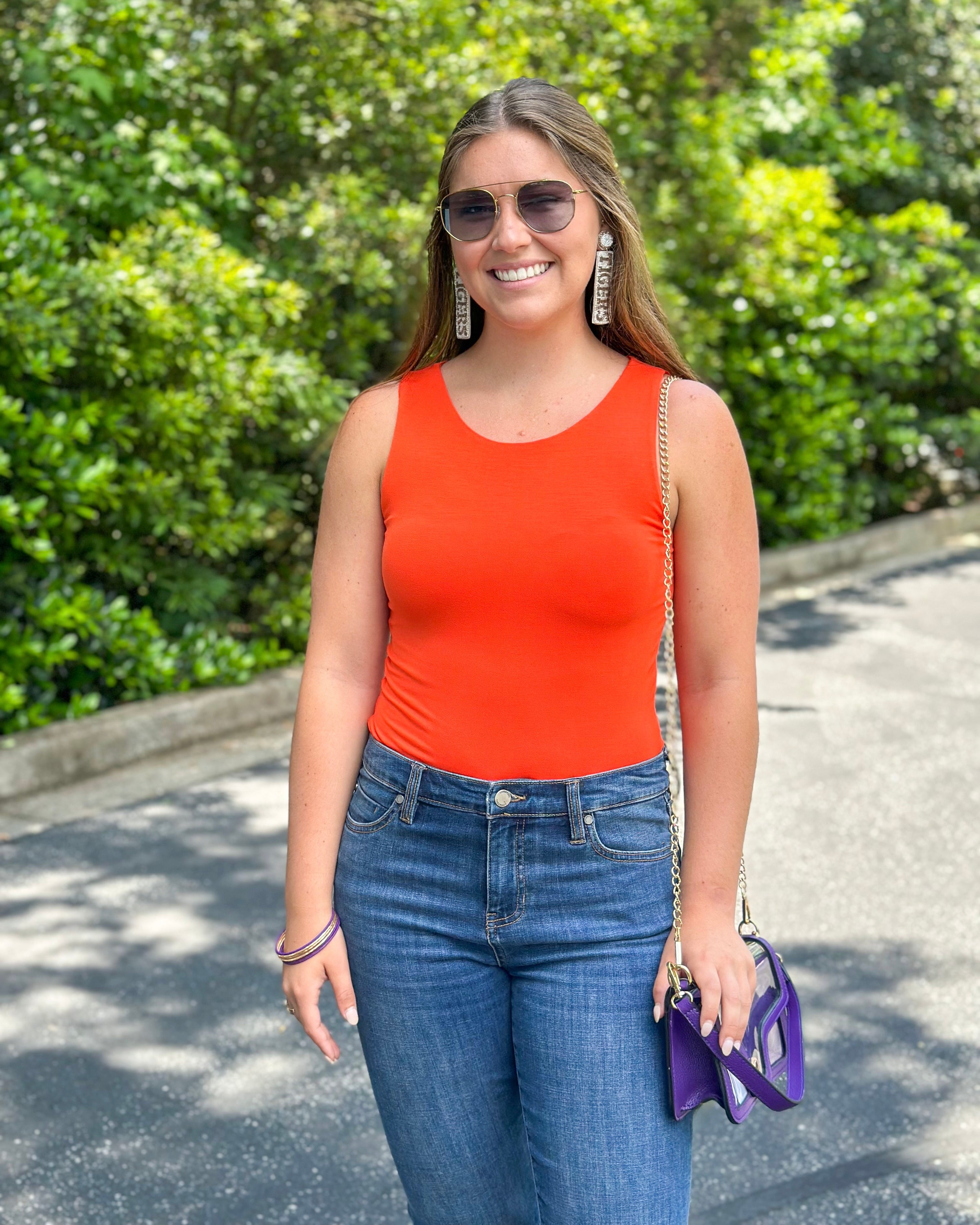 Every Clemson girl needs an orange body suit! Whether you're pairing with jeans or a skirt, this cutie can be paired with anything! With its super soft fabric and easy clasp, you will feel comfortable and secure all day long!