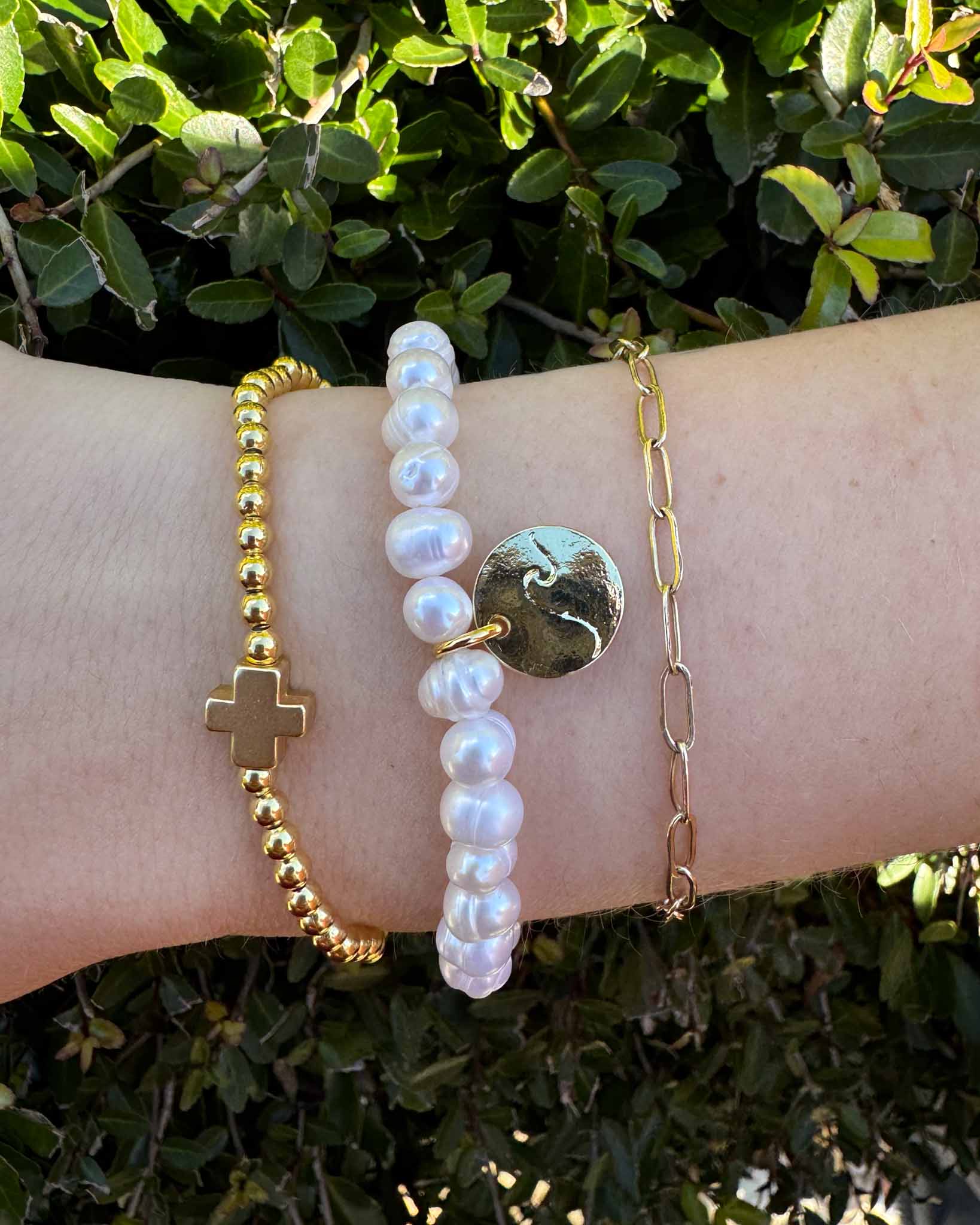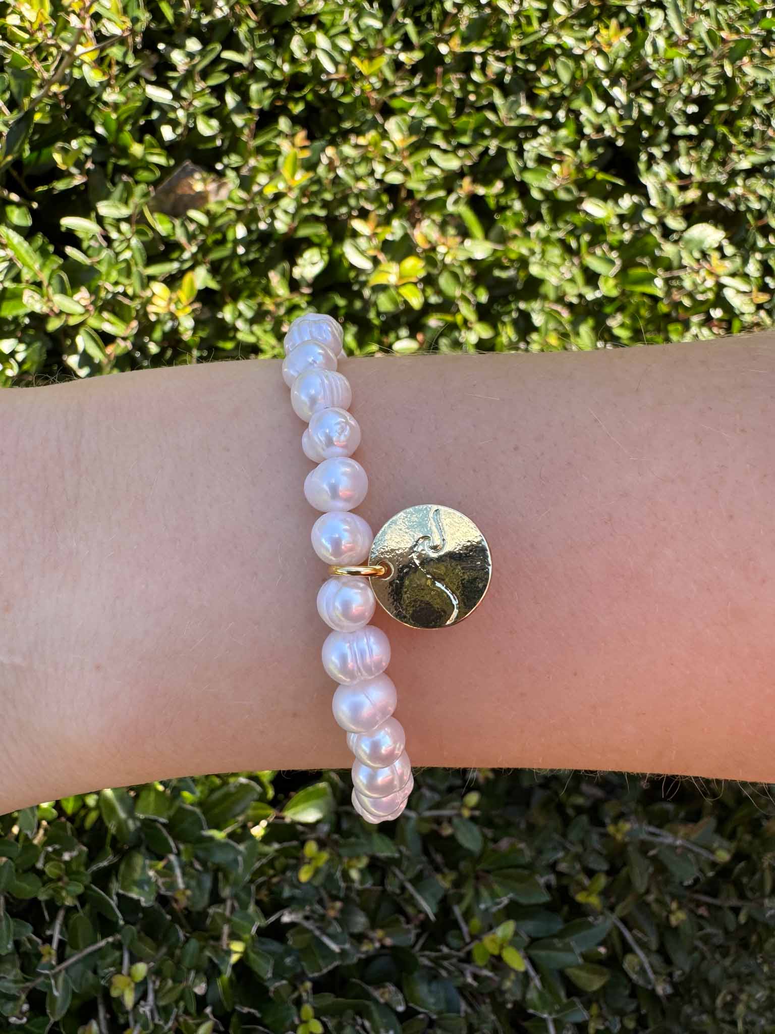 7" - made to stretch comfortably, 6mm pearls, ,5" gold charm