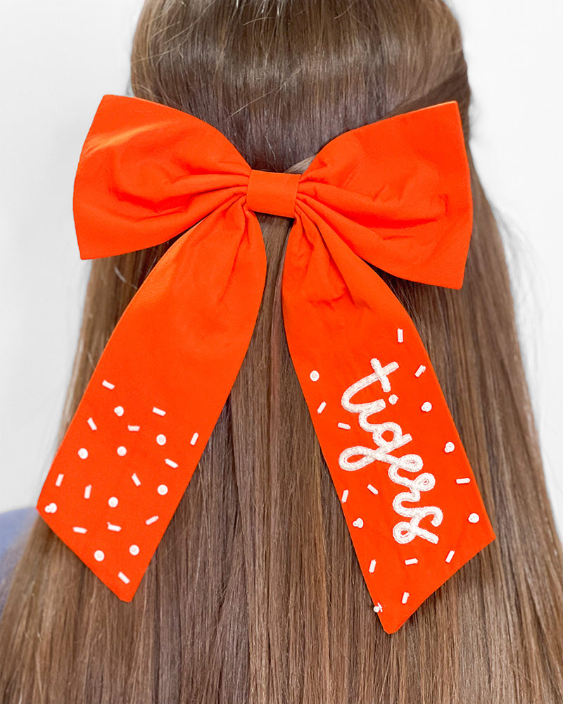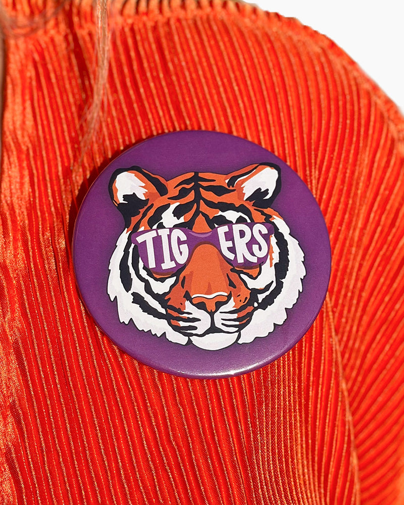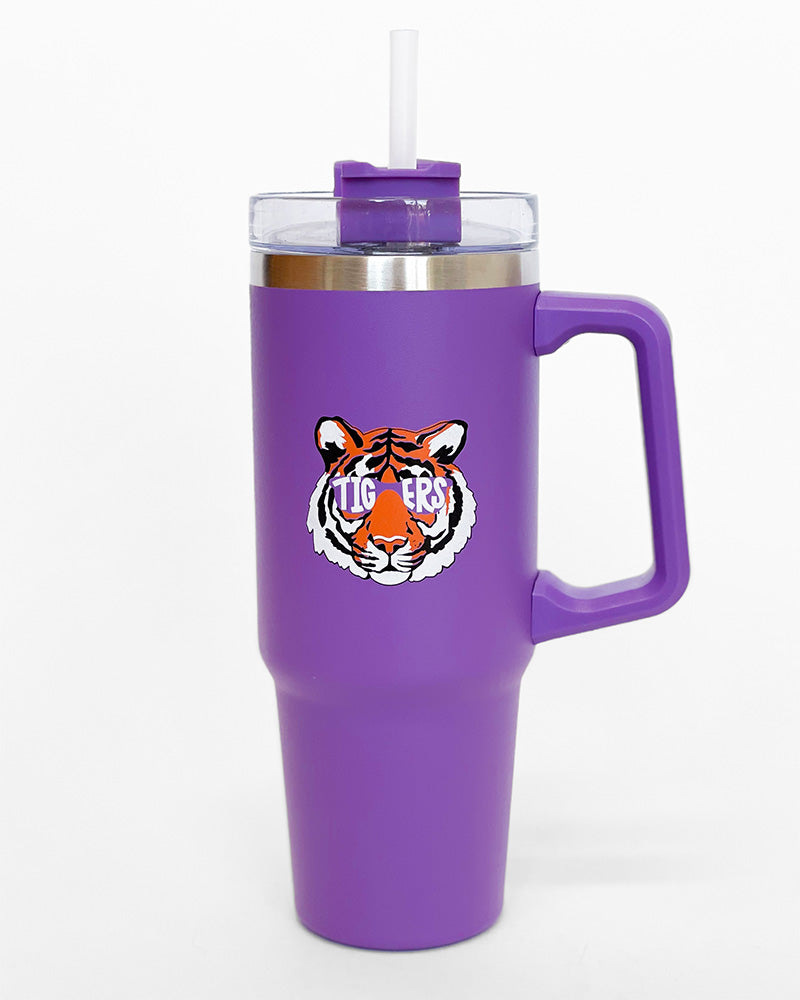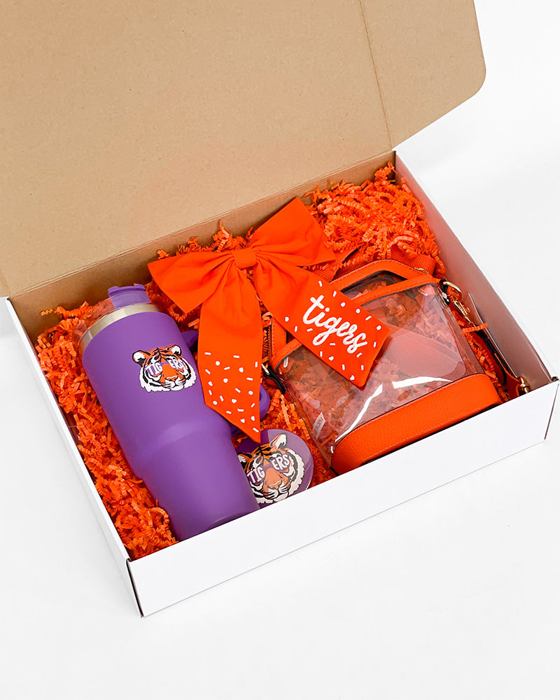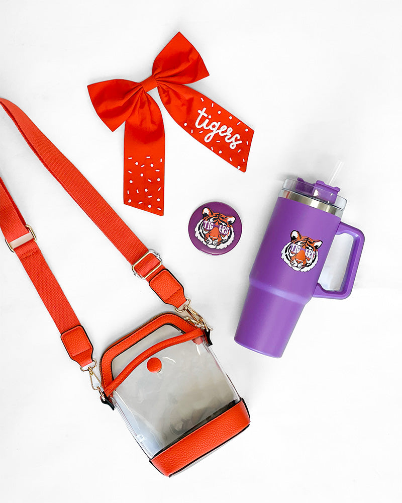 Every tiger could use a little surcie! This bundle is filled with all the goodies to make your tiger smile! Inside you will find the Tigers Butterfly Bow, Game Day Button - Purple Tiger, Purple Tiger Tumbler, and an Orange Trimmed Clear Bag!