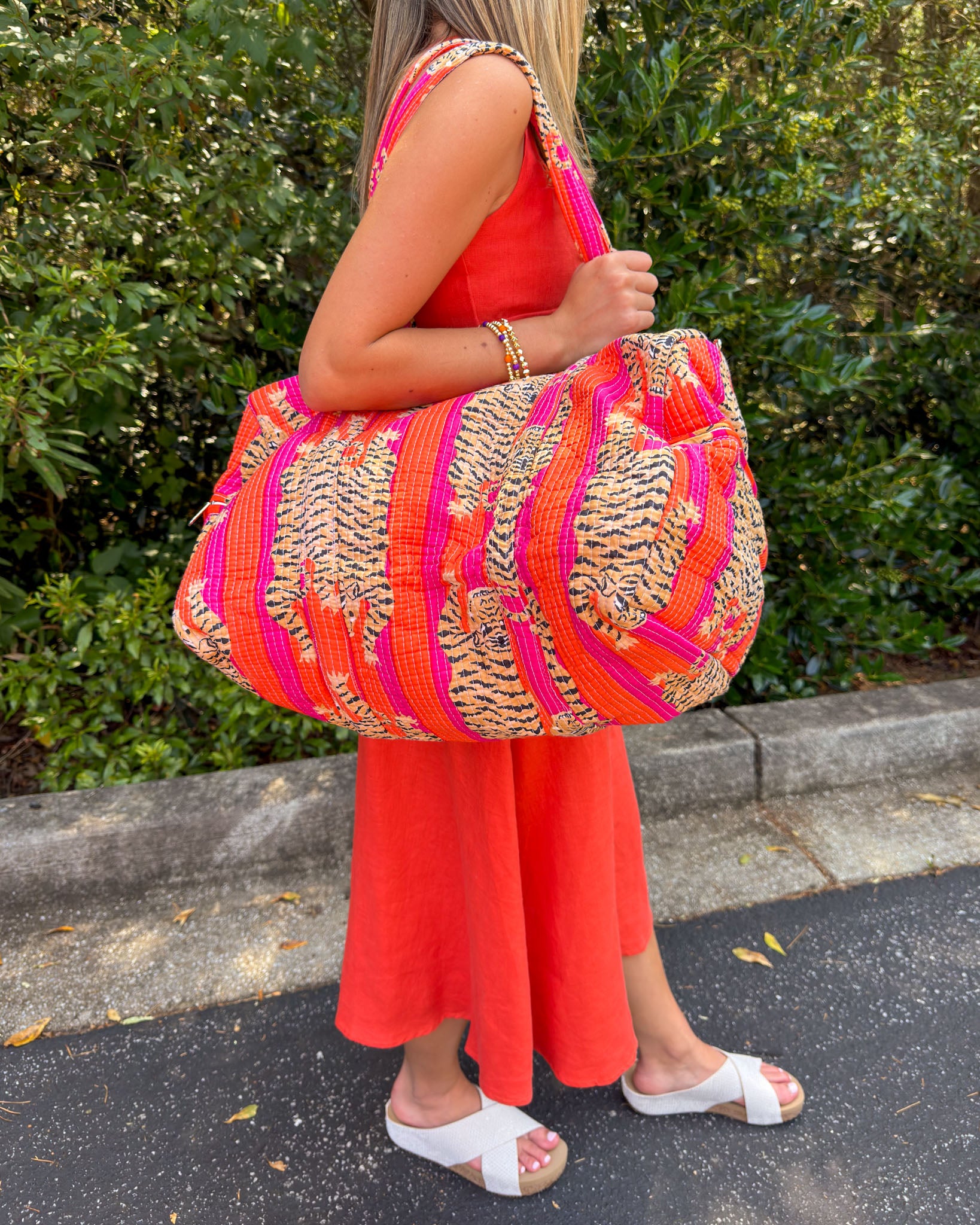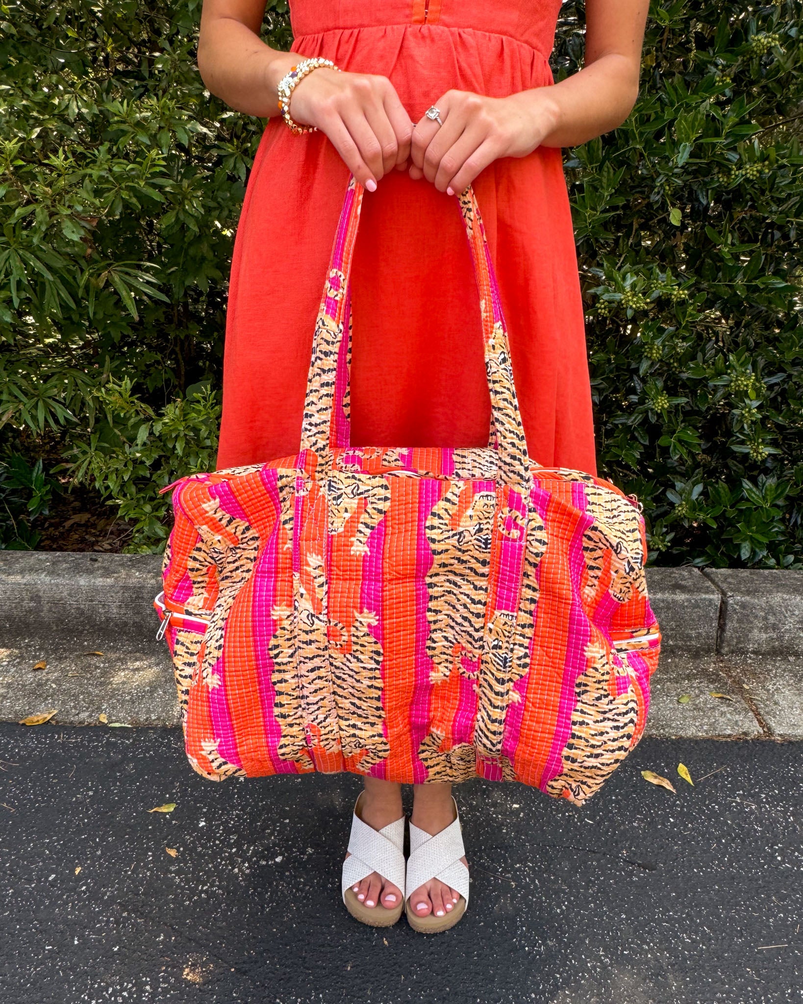 How fun is this cute duffle?! Show everyone you are ALL IN as a Tiger with this fun duffle bag! This adorable printed bag is perfect for all of your travels. It's big enough to hold all the things with a spacious interior and two outside pockets.
