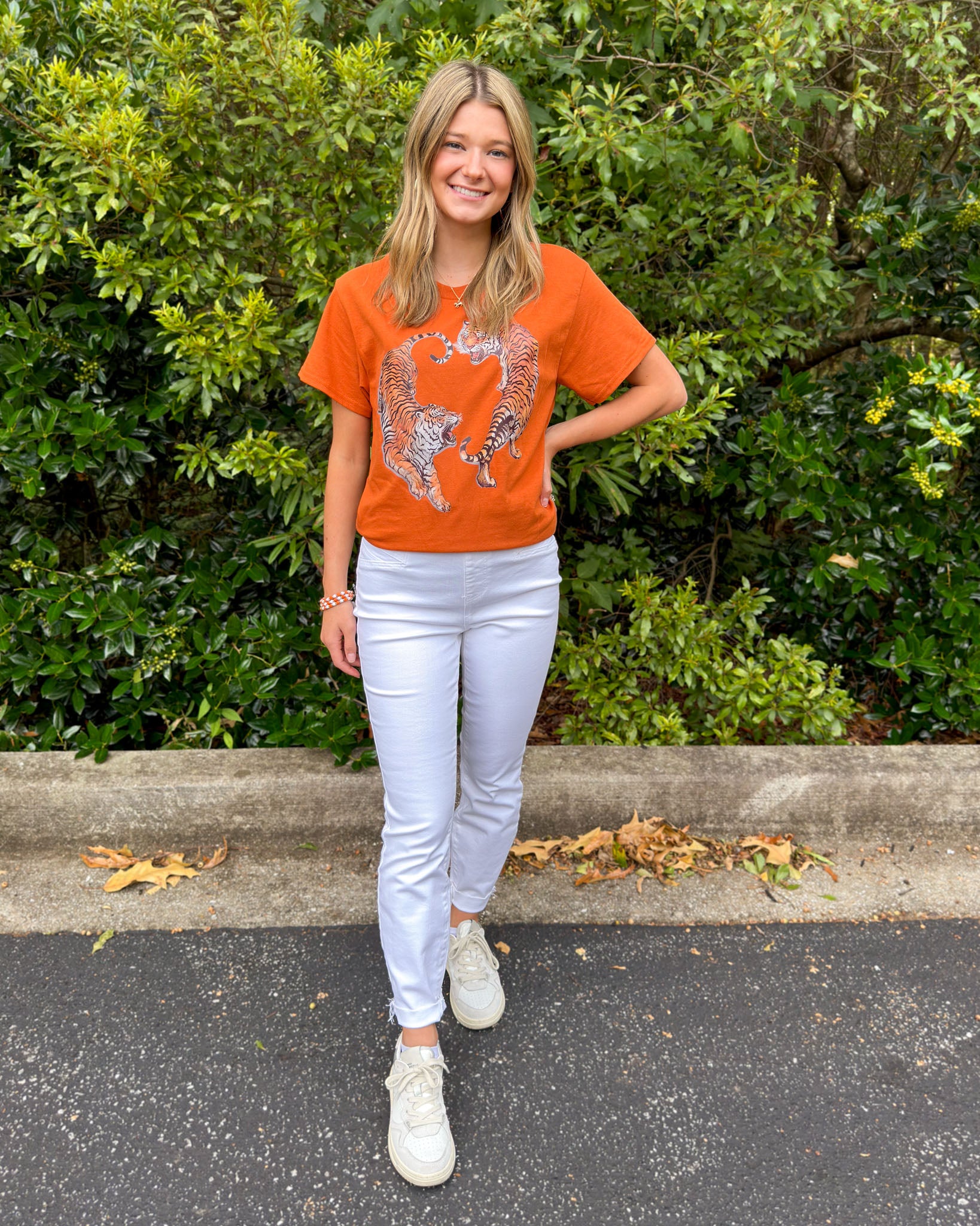 Want something fun and cute to throw on and go? This is the perfect top! Wear it with some leggings or dress it up with a pair of jeans! Great for game day to cheer on the Tigers! Also available in purple