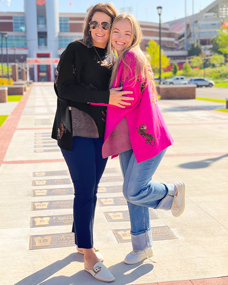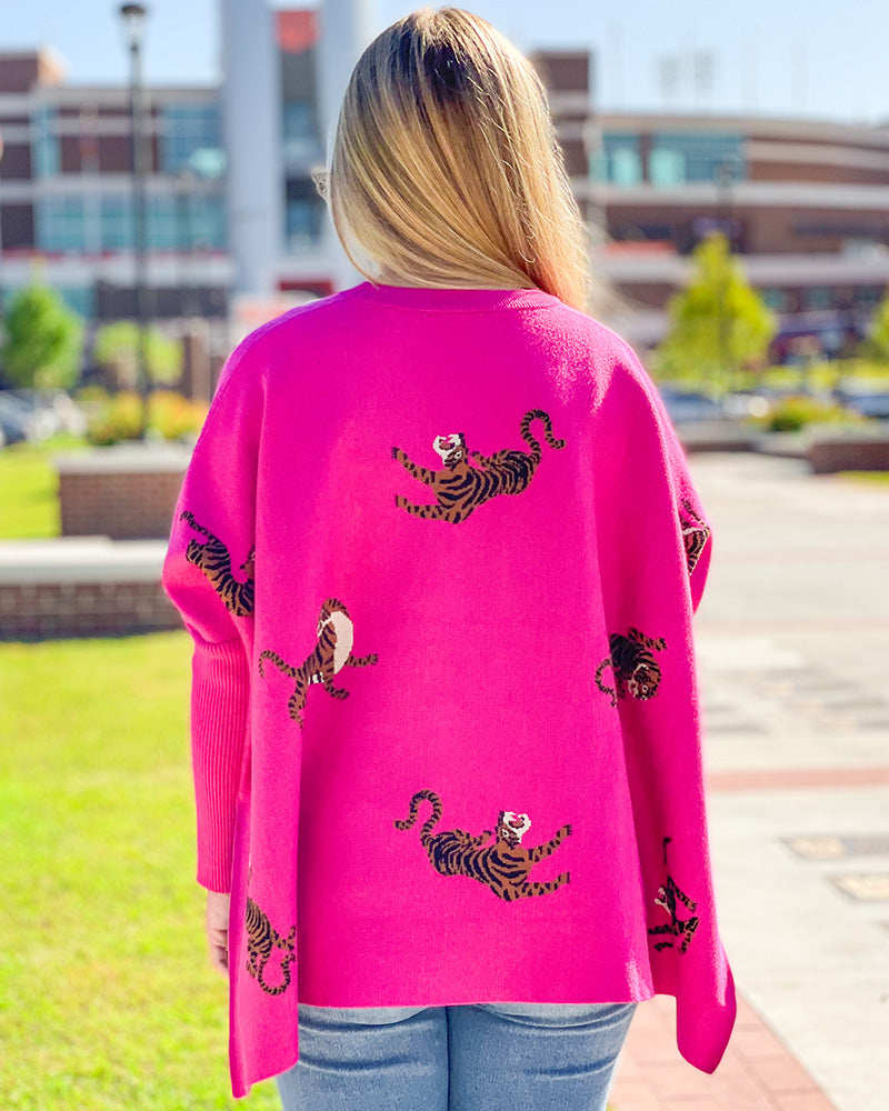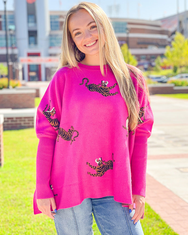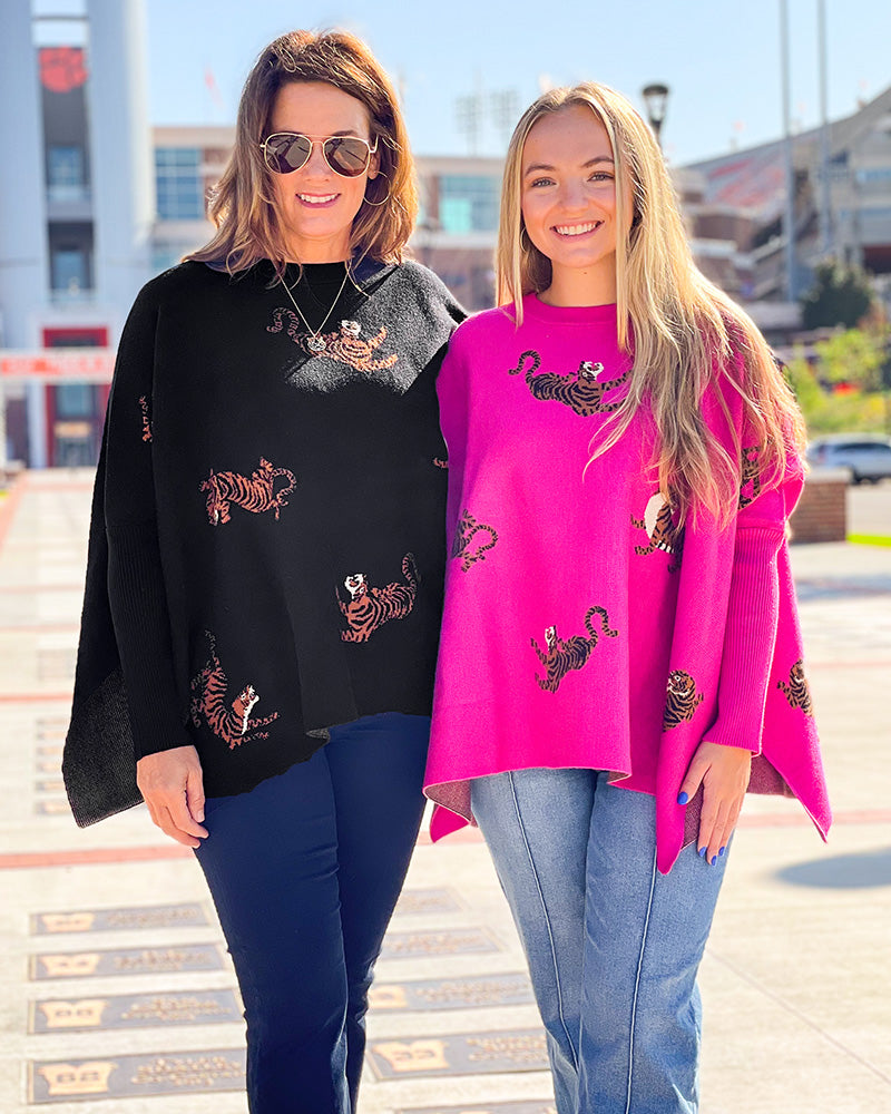 Show your spirit in this Tiger Poncho Sweater in Black! With fierce tigers, this sweater goes great with jeans or leggings! Pair it with booties and jeans for a cute, casual, and comfy look! Also available in Black.