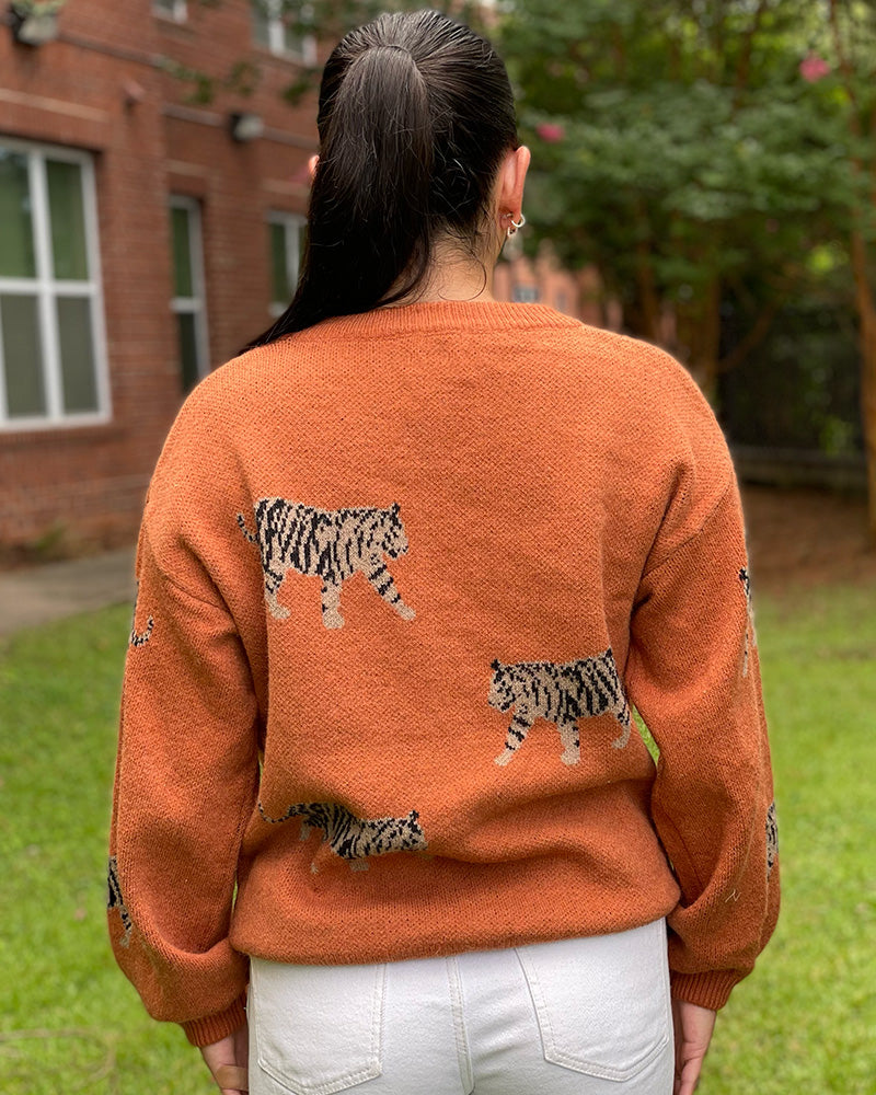 Show your spirit in this Tiger Walk Sweater in Rust! With fierce walking tigers, this sweater goes great with jeans or leggings! Pair it with booties and jeans for a cute, casual, and comfy look!