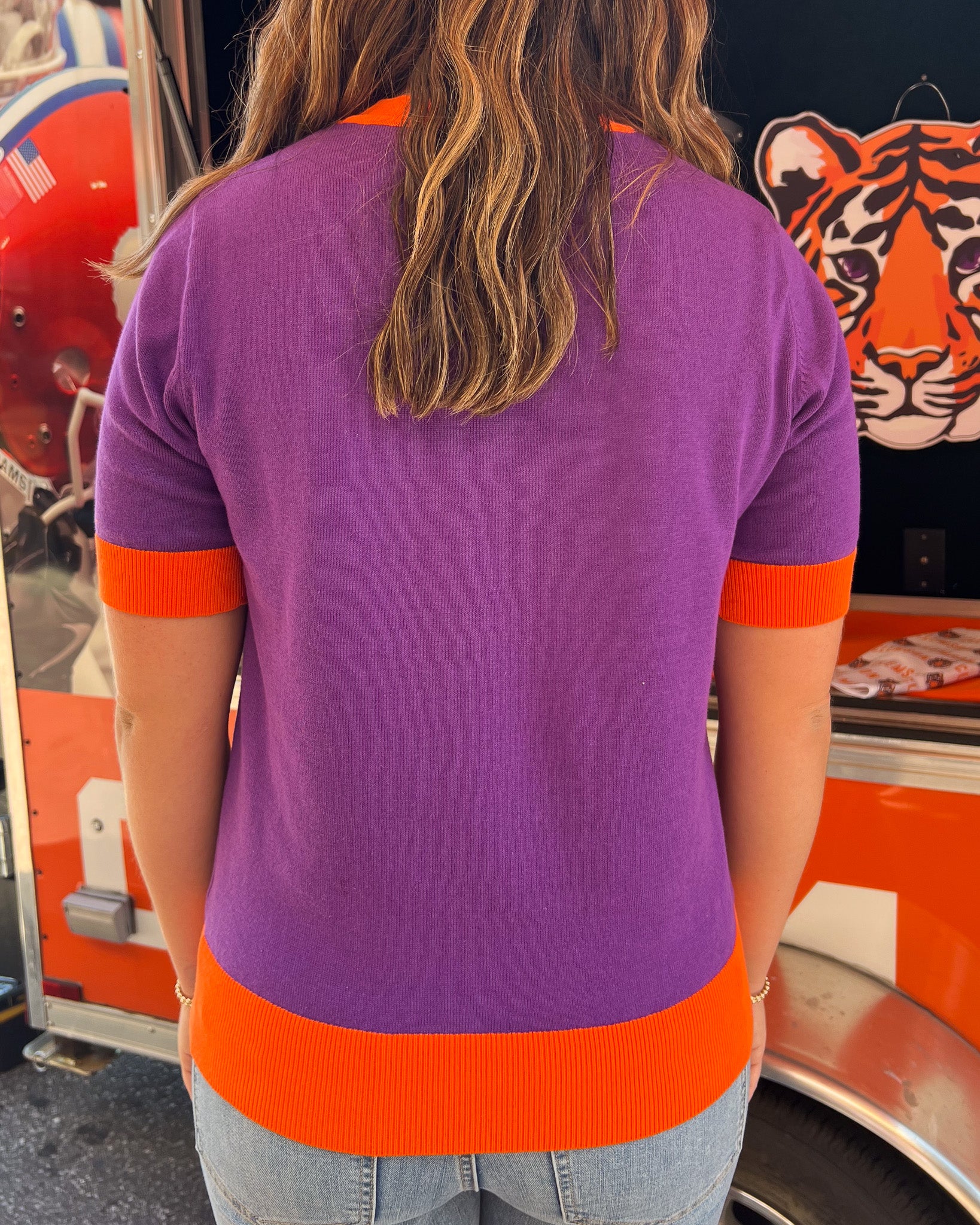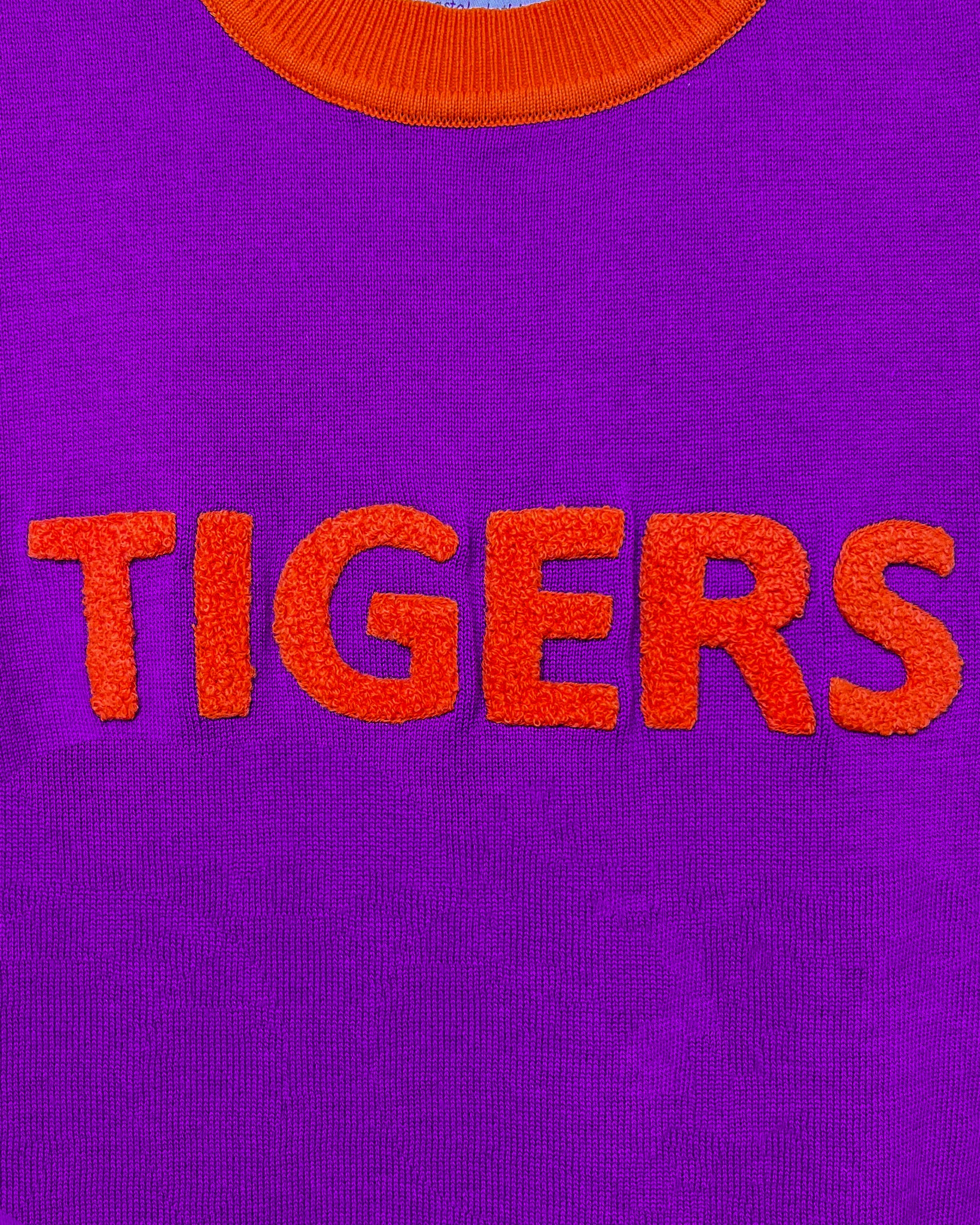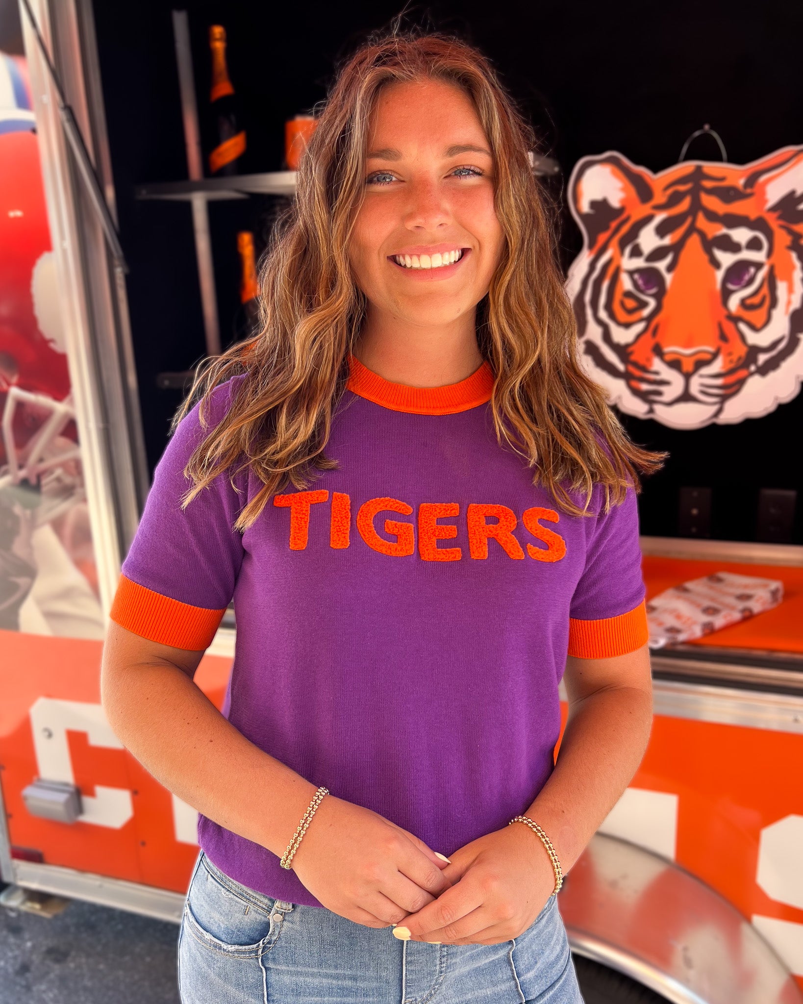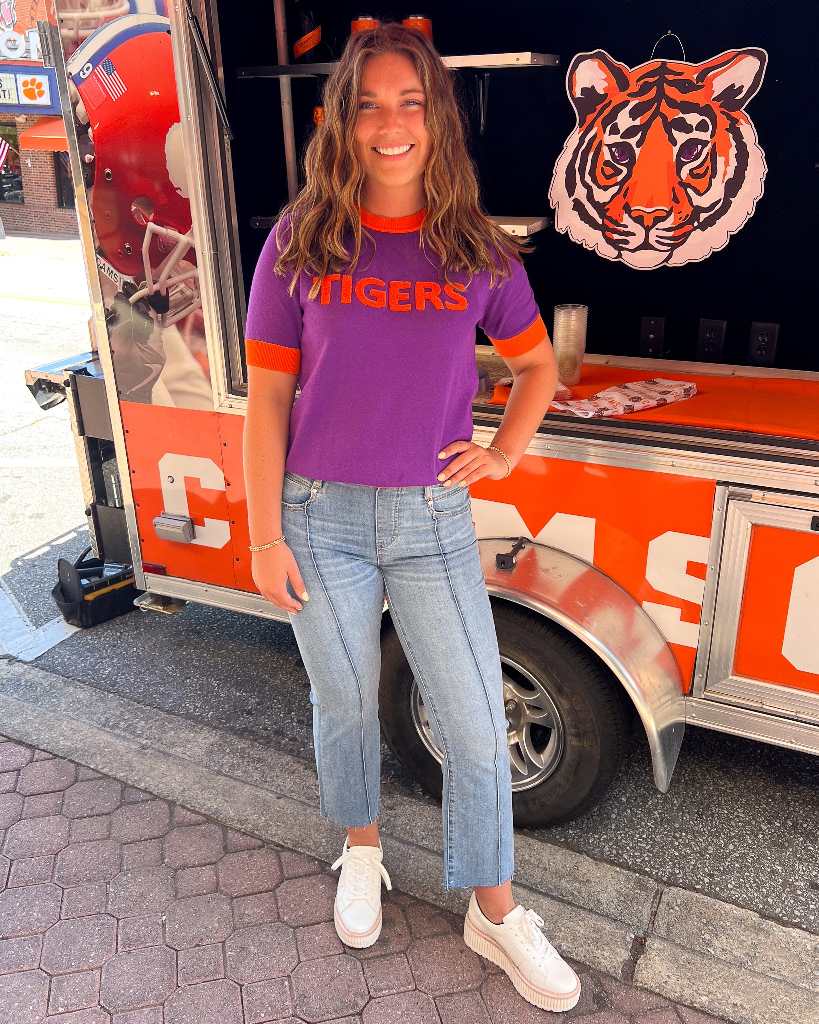 Be game day ready in this lightweight sweater top customized with the word Tigers in chenille textured letters. Pair this sweater top with denim and sneakers for the perfect game day fit!