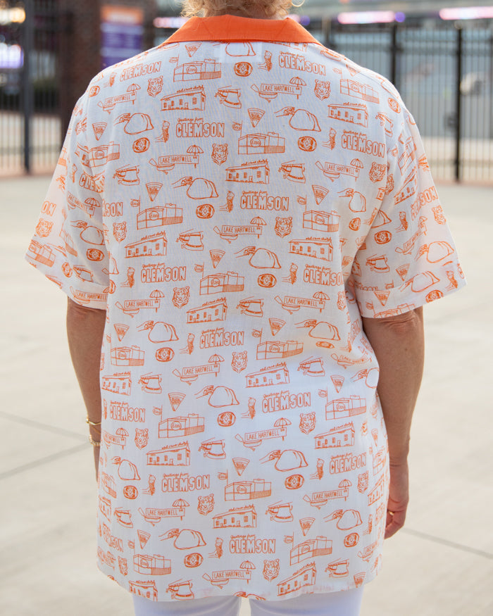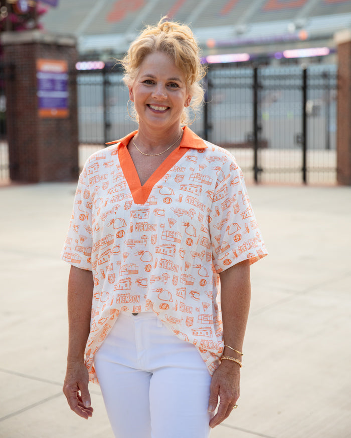 This top can be dressed up or worn casually! Celebrate all things Clemson with this fabulous toile print. The material is so lightweight, you will be reaching for it every chance you get! Wear it with your favorite jeans, or with a pair of denim shorts. It is sure to carry you through Game Day season!