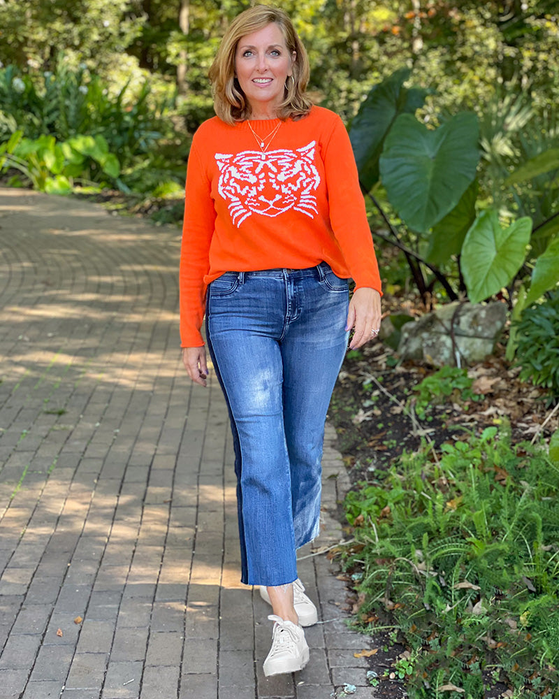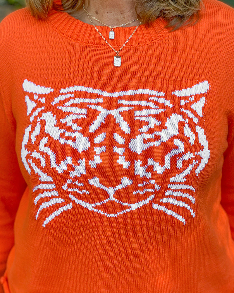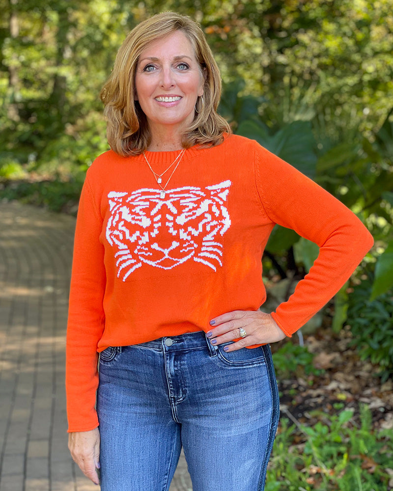 Get your game on! This one-of-a-kind design is just the look you need for game day. With a fierce tiger and bright orange color, this sweater is sure to make you the talk of the tailgate! Pair it with jeans for a casual look, or dress it up with a fun pair of pants!
